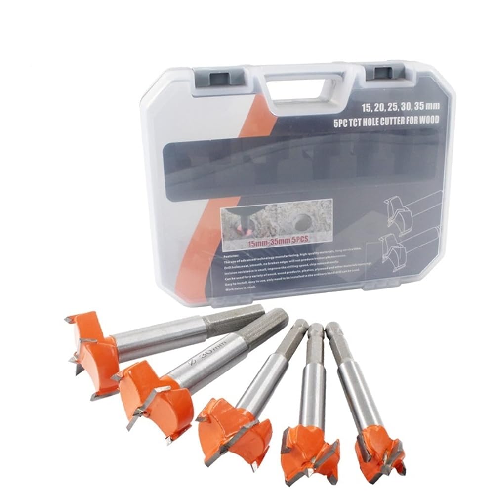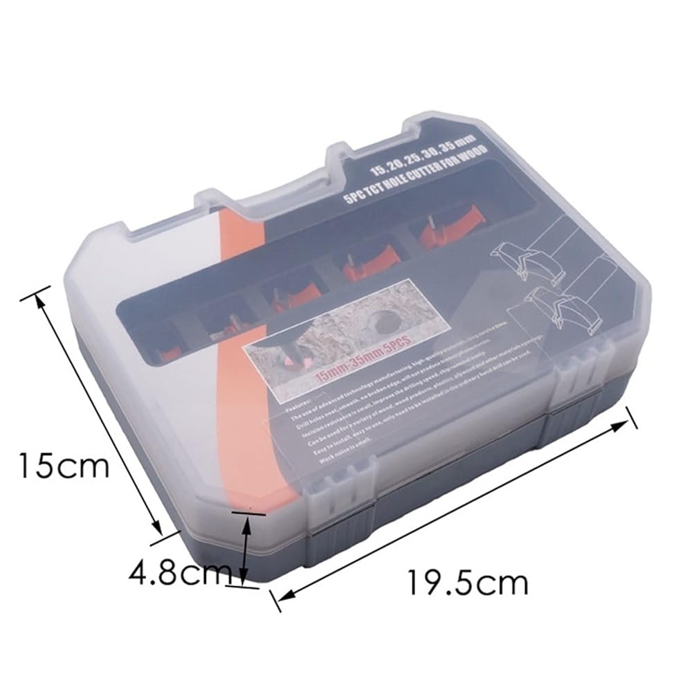 This Drillforce Carbide Forstner Bit Set includes 15, 20, 25, 30 and 35mm bits. Each bit features two cross tips and center cutter for smoother, faster and chatter free cutting.
