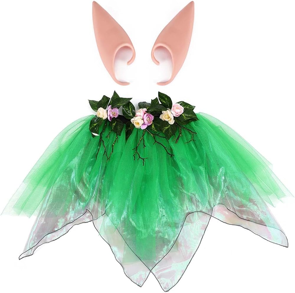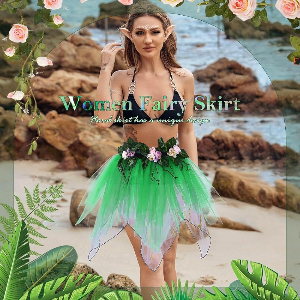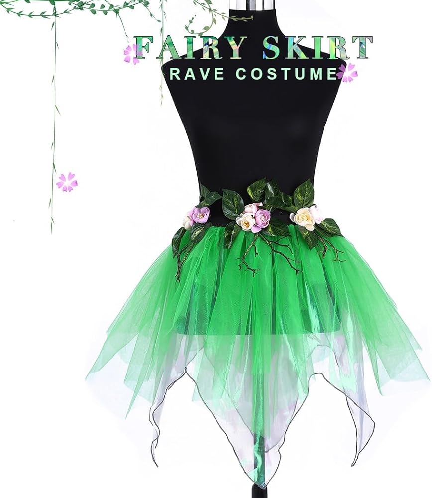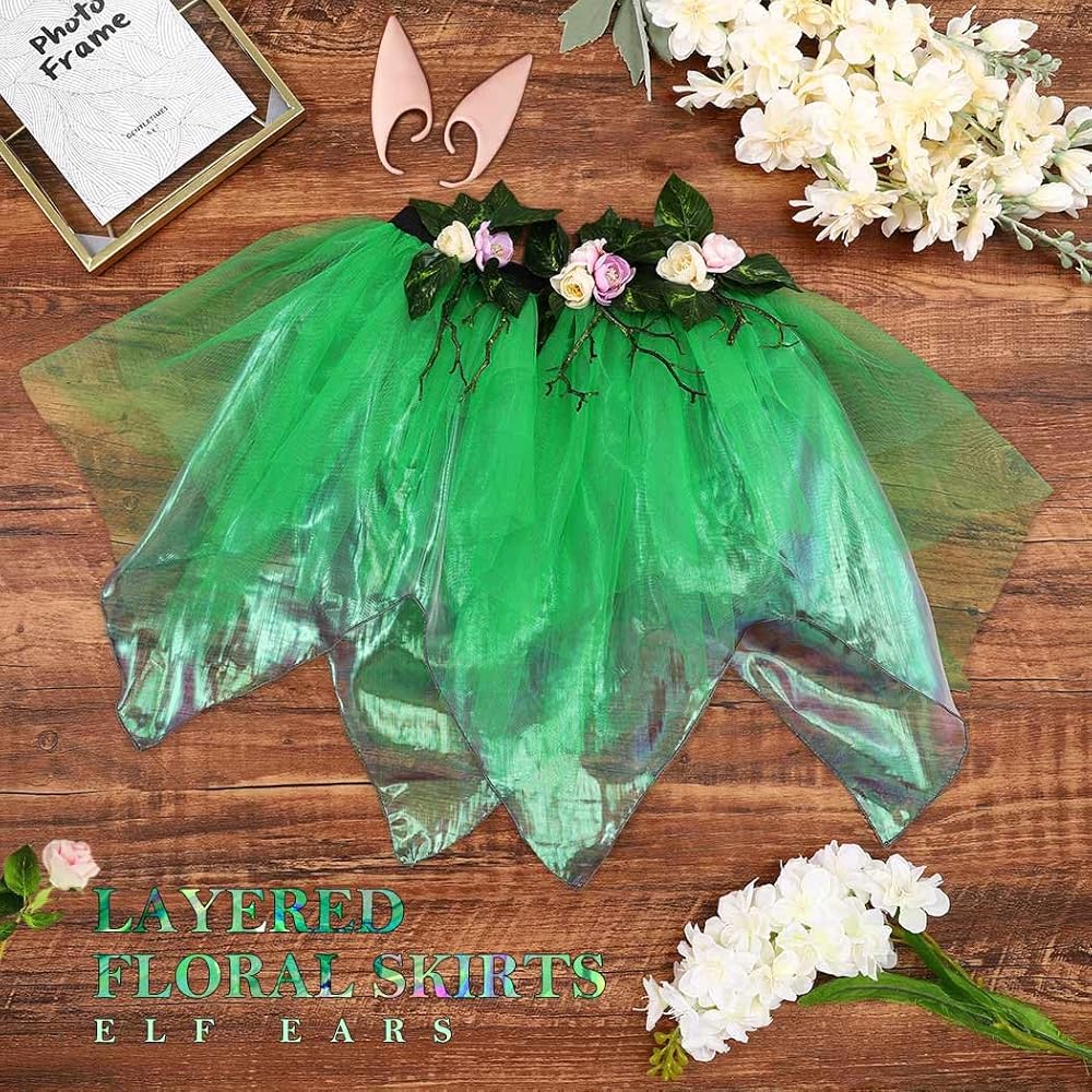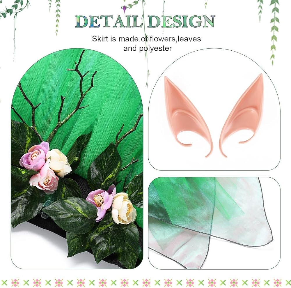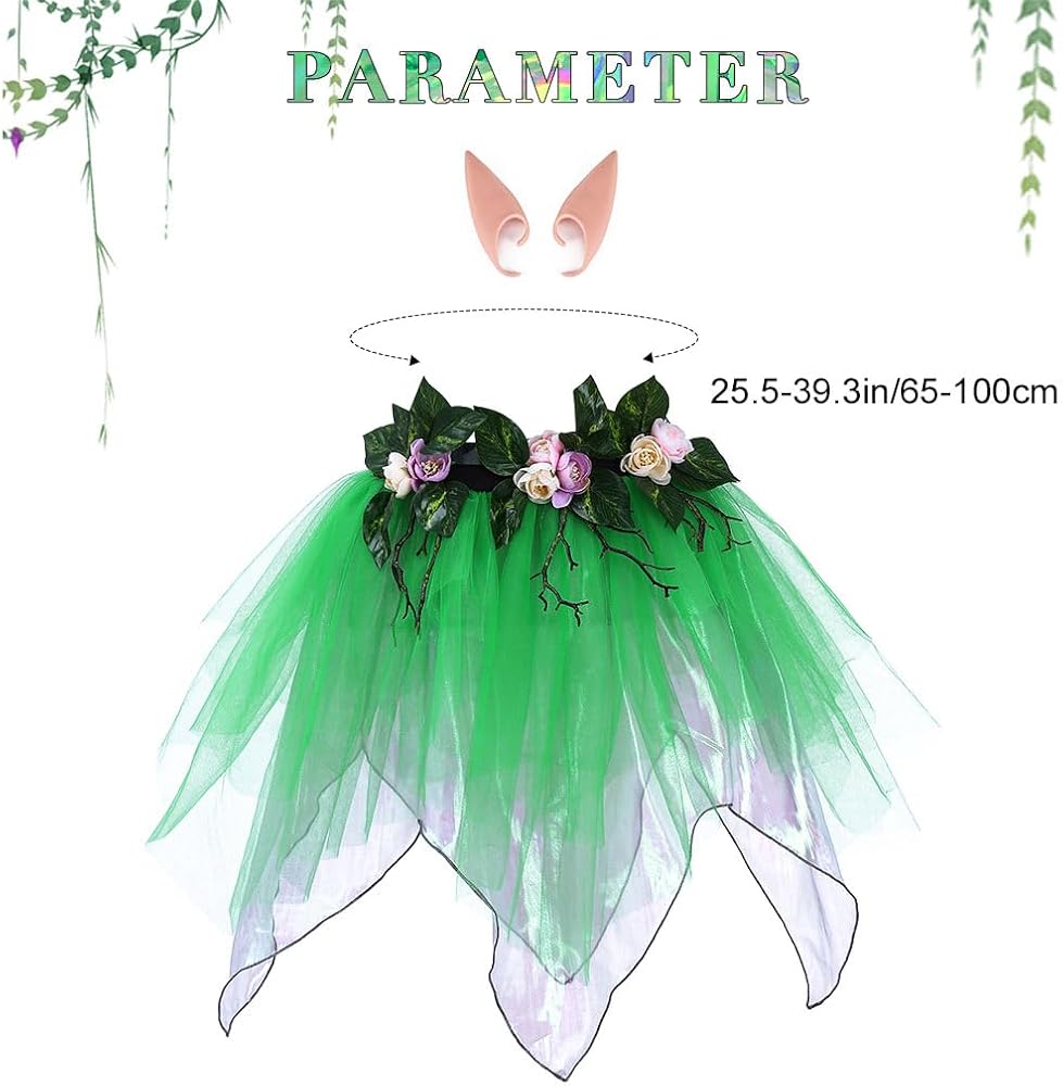 تنورة الجنية مصنوعة من الزهور وأوراق الشجر والبوليستر.متوفرة باللون الأخضر.كما هو موضح في الصورة.