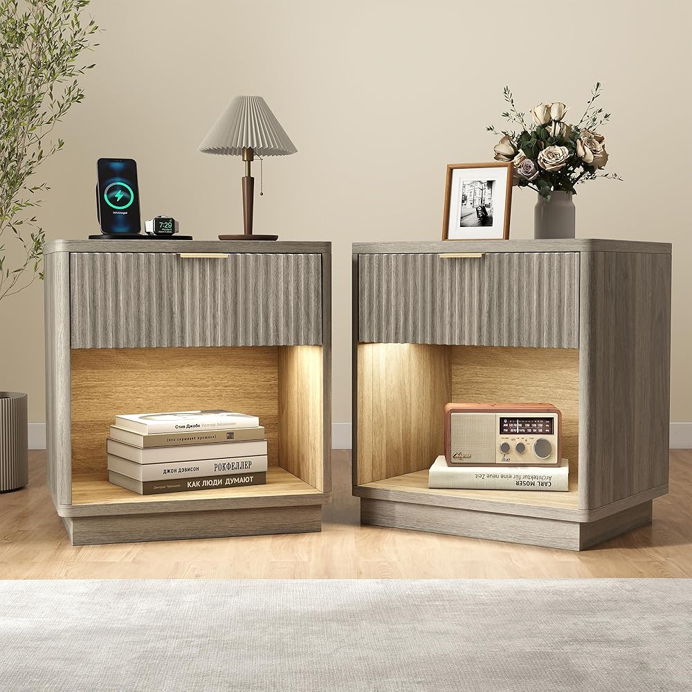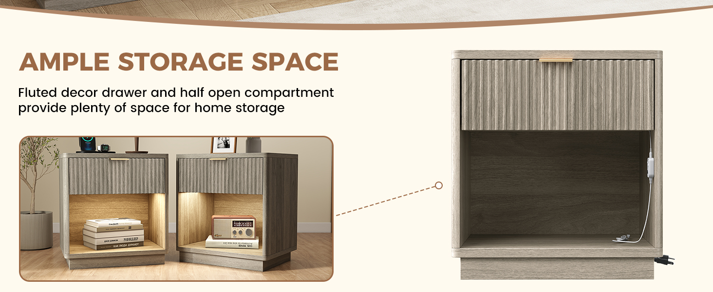 【مساحة تخزين واسعة】إطار المنضدة الطبيعي مصنوع من الخشب الهندسي ويحتوي على درج ديكور مخدد بعمق 9.25 بوصة وأرفف مقصورة مفتوحة توفر مساحة تخزين واسعة للعملاء. يبلغ ارتفاع المنضدة 24.02 بوصة. ومجهز بشريط إضاءة مستشعر يمكنه إضاءة ليلتك في أي وقت