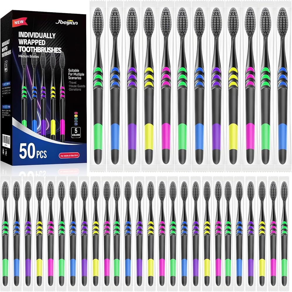 مجموعة 50 فرشاة أسنان فاخرة مغلفة بشكل فردي، فرش أسنان للاستعمال مرة واحدة، فرشاة أسنان للأطفال، فرشاة أسنان ذات شعيرات متوسطة ناعمة، مقبض مريح، مثالية للتبرع بالفنادق أثناء السفر