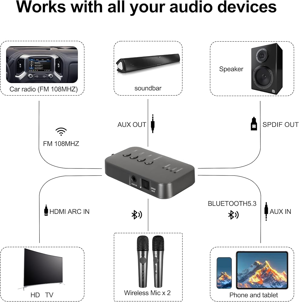 نقل FM للسيارة كاريوكي يسمح لك جهاز إرسال FM المدمج بمزامنة المحول مع نظام الصوت FM الخاص بسيارتك لاسلكيًا. حوّل رحلاتك البرية أو تنقلاتك أو رحلاتك العائلية إلى حفلات كاريوكي مبهجة. ما عليك سوى ضبط راديو سيارتك على التردد المطابق، وسيقوم المحول بنقل مرافقة واضحة وأصوات صوتية، مما يضمن أن يتمكن كل شخص في السيارة من الانضمام إلى المرح دون أسلاك معقدة