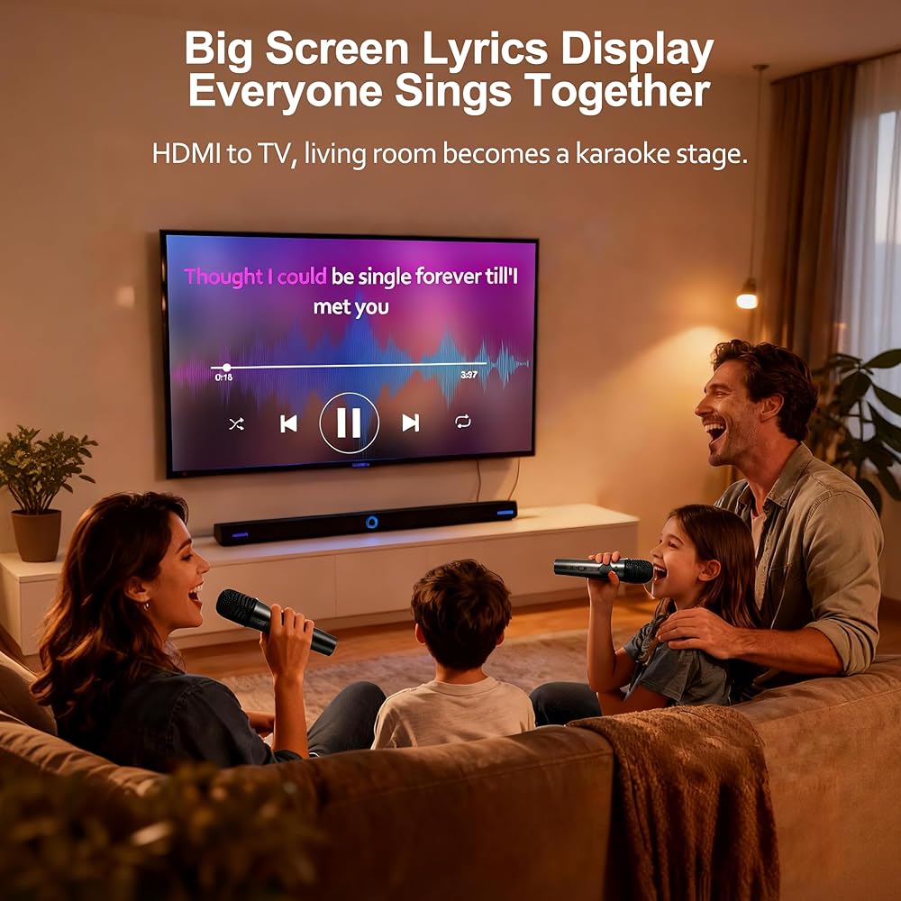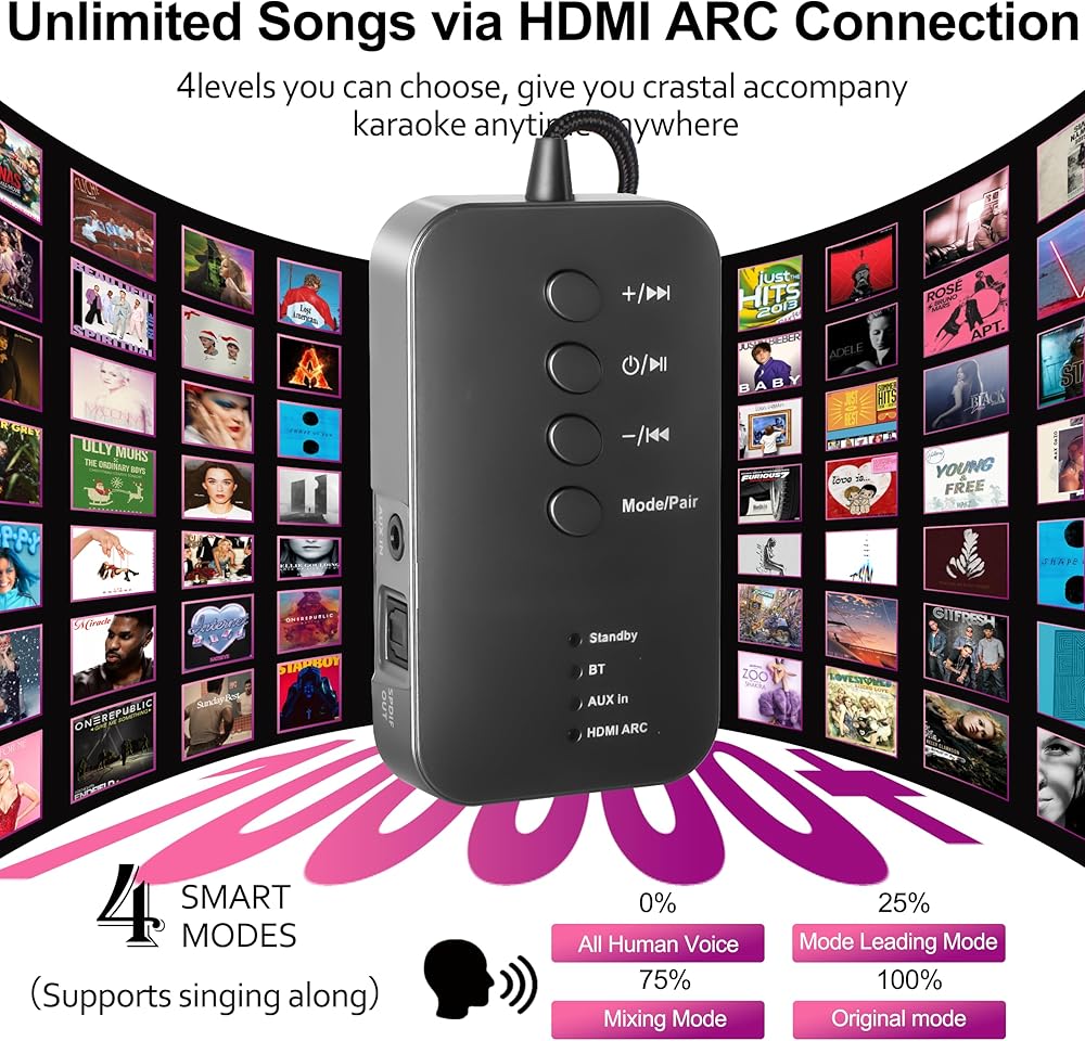 أغاني غير محدودة عبر اتصال HDMI ARC يمكنك الاتصال بسلاسة بالتلفزيون الخاص بك عبر إدخال HDMI ARC للوصول إلى مكتبة لا نهاية لها من الأغاني. سواء كنت تقوم ببث الموسيقى من المنصات الشهيرة أو تشغيل ملفات الفيديو المحلية على التلفزيون الخاص بك، فإن المحول يلتقط الإشارات الصوتية في الوقت الفعلي، مما يحول غرفة المعيشة الخاصة بك إلى صالة كاريوكي احترافية. لا حاجة إلى أجهزة تخزين إضافية للأغاني، ما عليك سوى اختيار أغنية على جهاز التلفزيون الخاص بك والبدء في الغناء على الفور