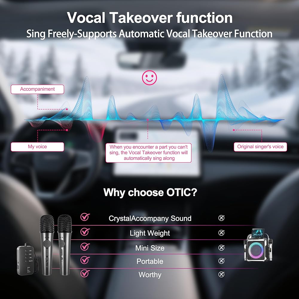 جهاز كاريوكي محمول OTIC AI، ميكروفونات كاريوكي متعددة الوظائف ومحول متعدد الاقتران، ميزة إزالة الصوت التلقائي/الغناء على طول؛ يدعم الغناء في المنزل/الخارج/السيارة للحفلات والتخييم والسفر