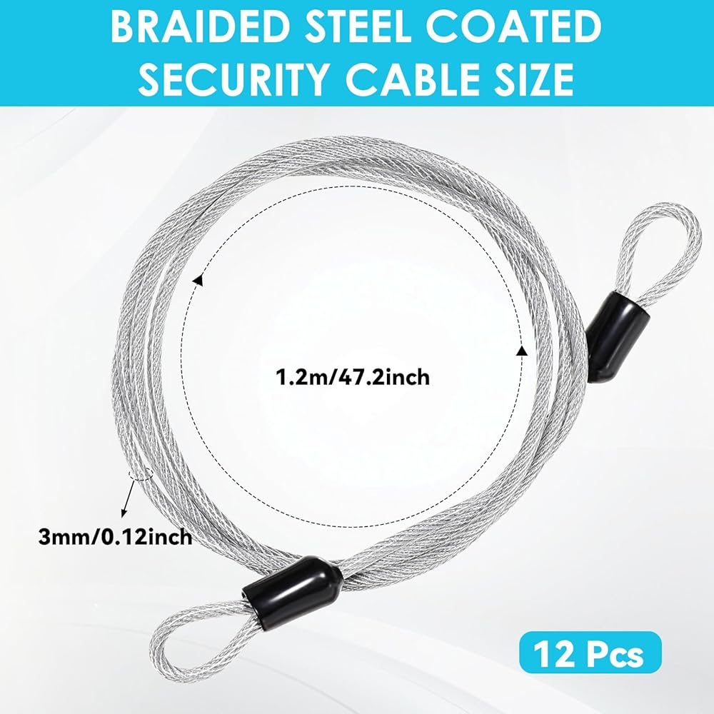 Package and Basic Specs: You'll receive 12 pieces of our silver - colored steel cable with loops. Made of stainless steel, it has a diameter of 3mm (0.12inch) and a total length of 1.2m (47.2inch). These are ideal for various locking needs like a cable lock, providing ample supply for daily use