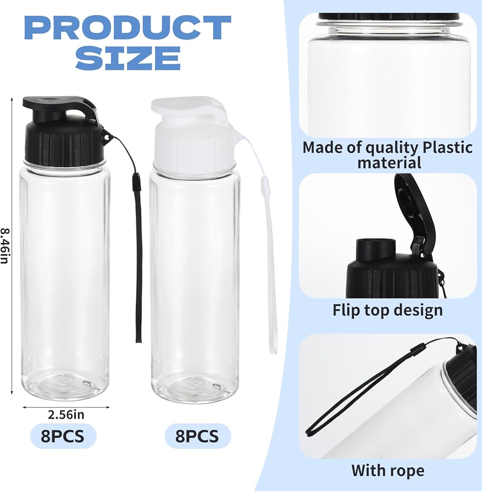 كمية كبيرة وسعة مثالية: تأتي مع 16 زجاجة مياه قابلة لإعادة الاستخدام (8 بيضاء + 8 سوداء)، يبلغ قياس كل منها حوالي 8.5 بوصة × 2.6 بوصة وتتسع لـ 17 أونصة/500 مل. مثالي للعائلات أو الفرق أو المكاتب أو المناسبات، مما يضمن حصولك دائمًا على زجاجة جاهزة للترطيب في أي مكان تذهب إليه