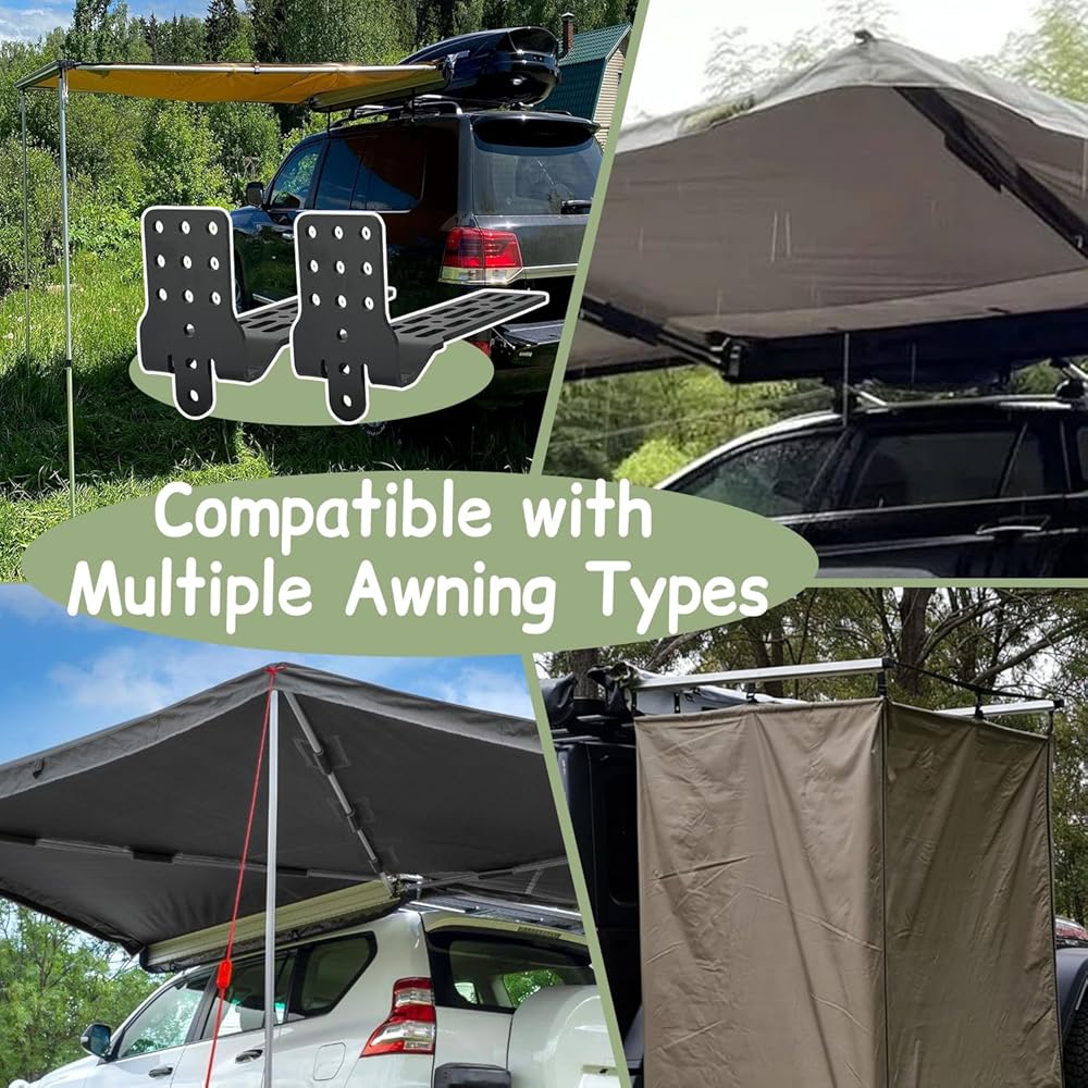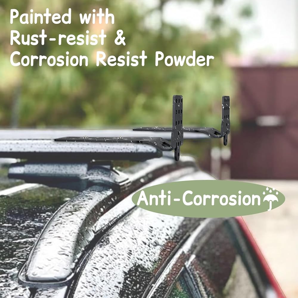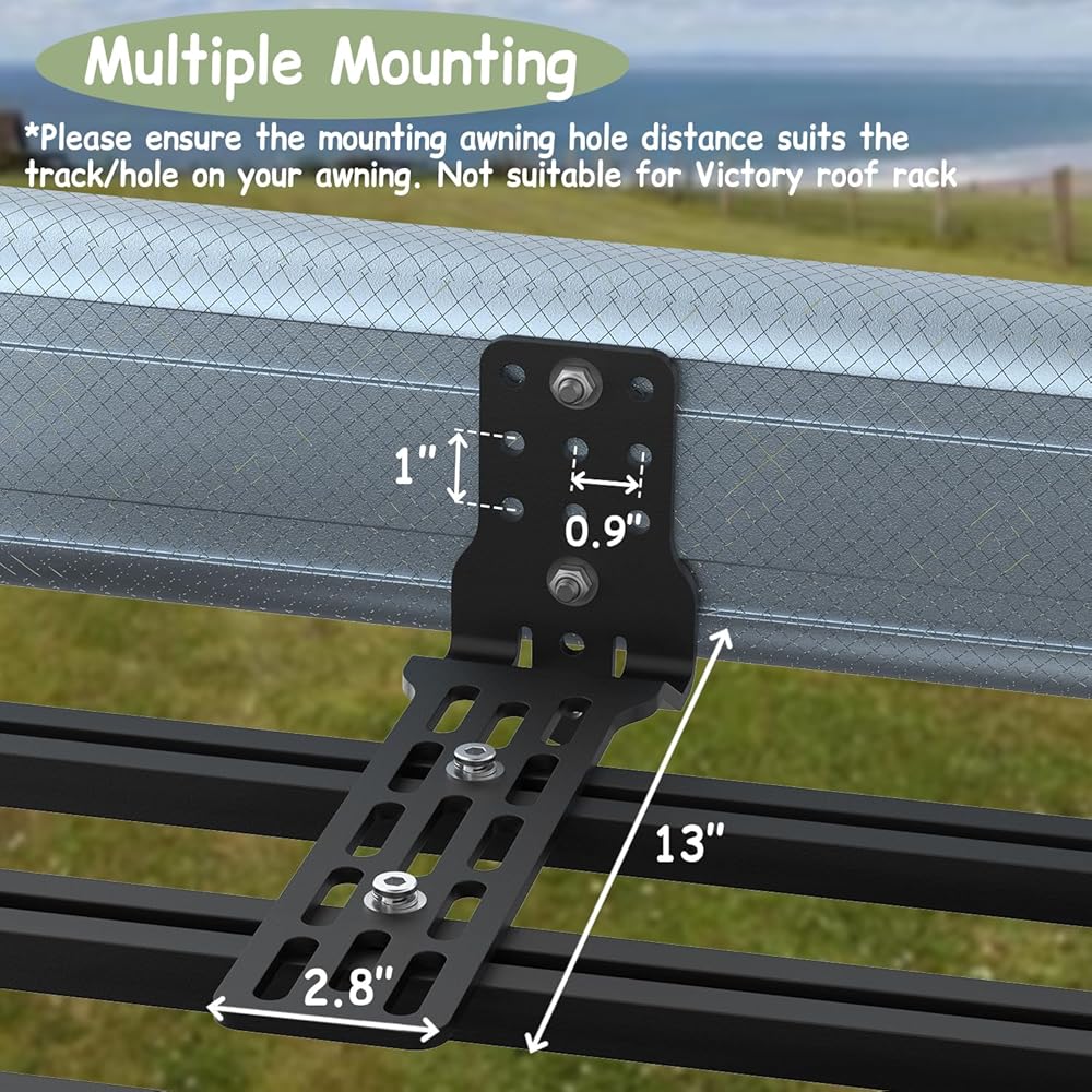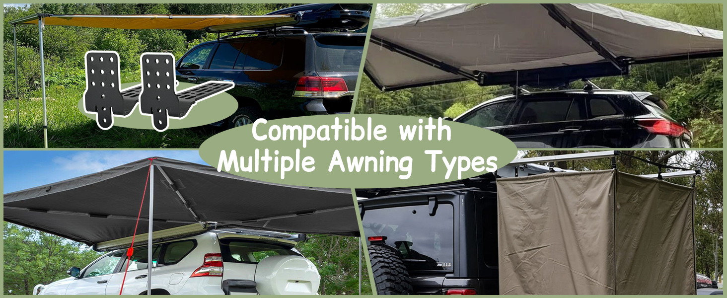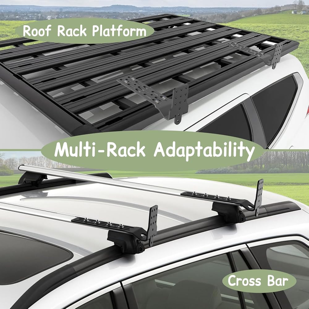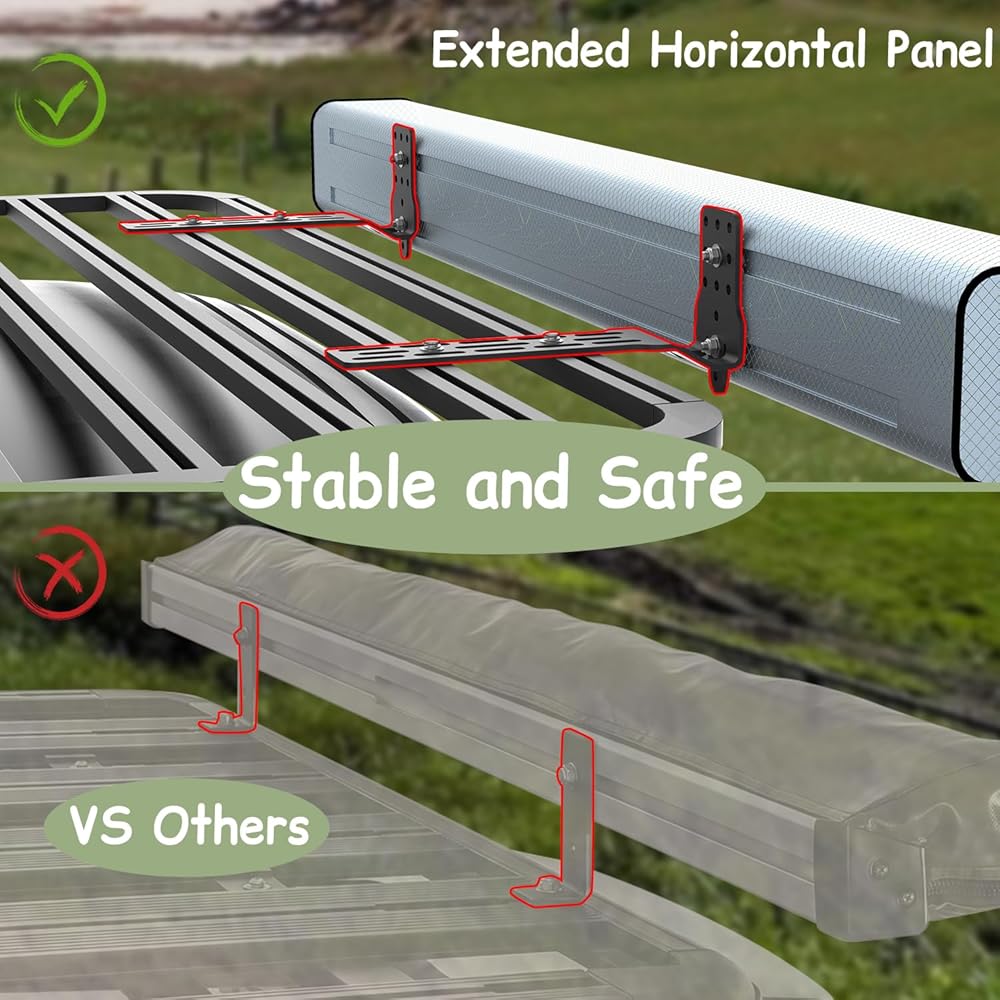 القدرة على التكيف مع الرفوف المتعددة: دعامات تثبيت المظلة مناسبة لمعظم رفوف السقف، سواء منصة حامل السقف أو القضيب المتقاطع. تم تجهيز دعامة تثبيت المظلة بفتحات ممدودة متعددة وصواميل منزلقة، متوافقة مع مسافات فتحة رف السقف المختلفة.