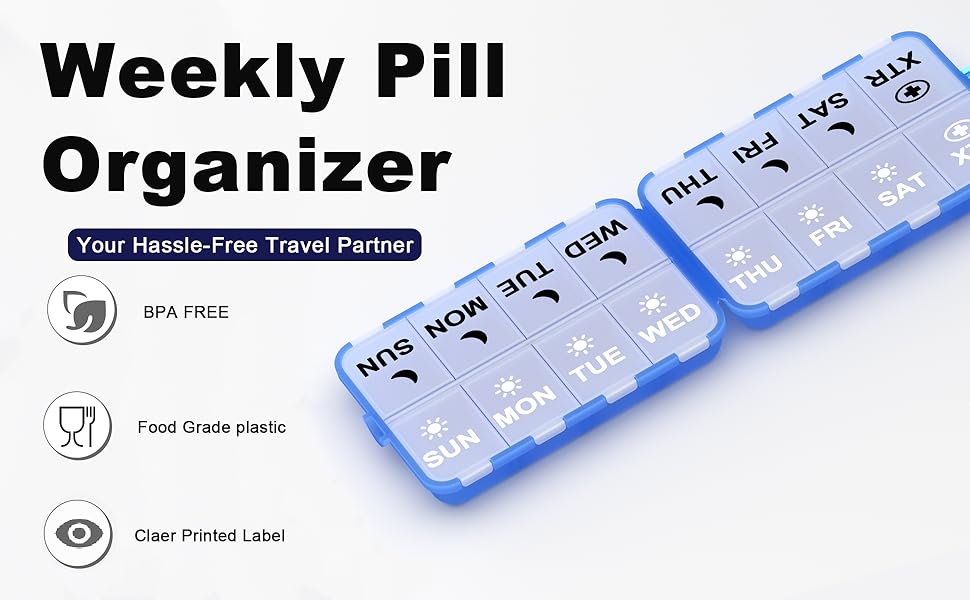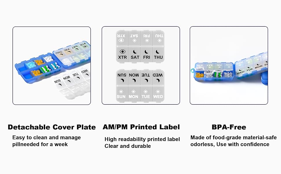 مادة عالية الجودة: بولي بروبيلين (PP) خالٍ من البيسفينول A، مقاوم للحرارة وعديم الرائحة، لوحة الغطاء القابلة للإزالة سهلة التركيب والتنظيف، لذلك يمكنك استخدام علبة حبوب الدواء براحة البال.