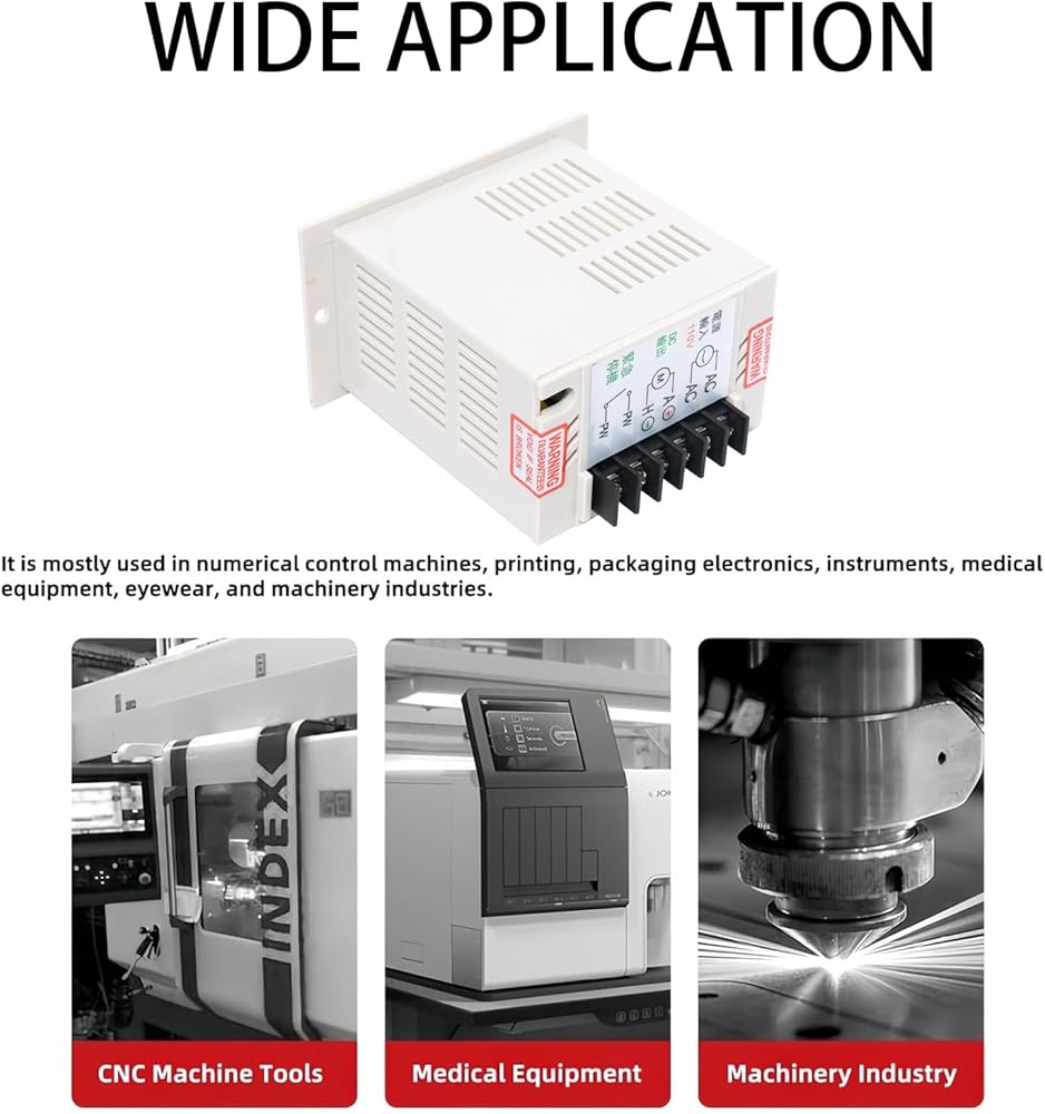 Designed for common small-to-medium-sized motors, it smoothly changes their speed. It's a great fit for various machines in packaging, printing, electronics, and clothing. For example, in packaging for conveyor belts, in printing for presses, in electronics for manufacturing equipment, in clothing for sewing machines.