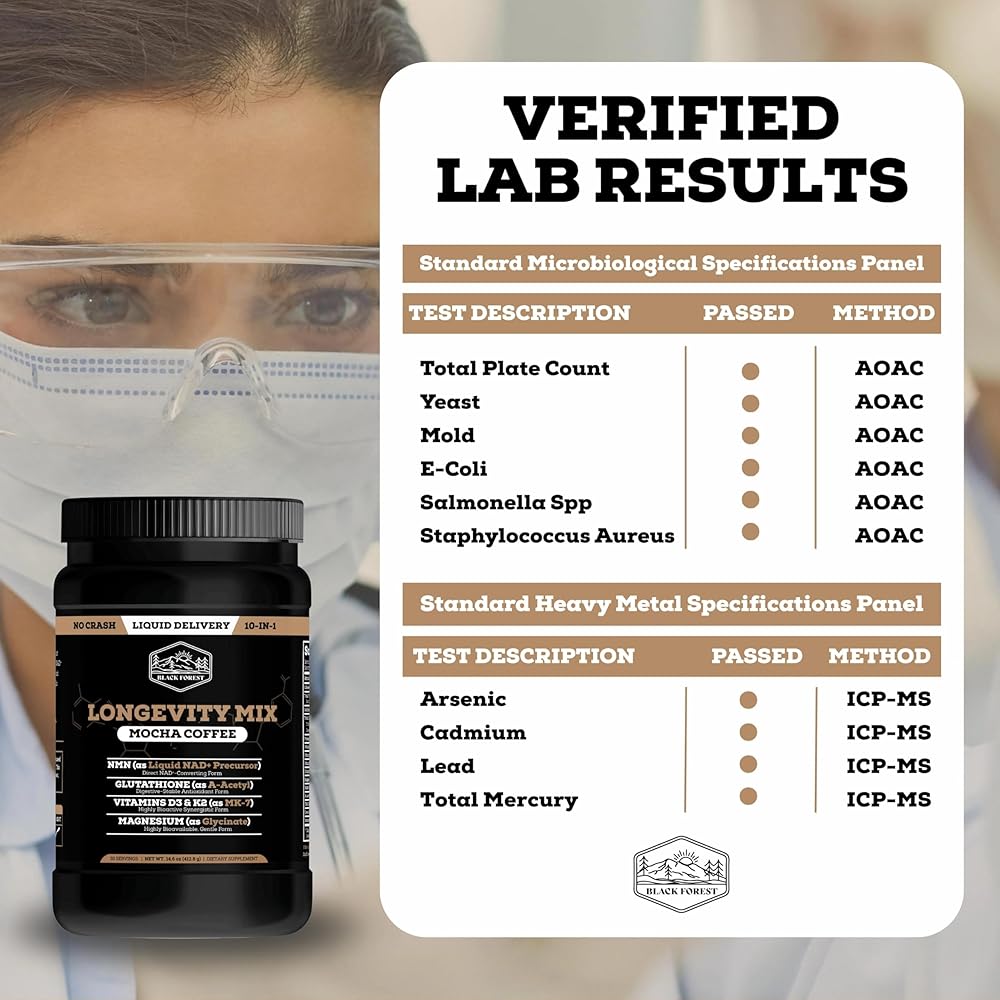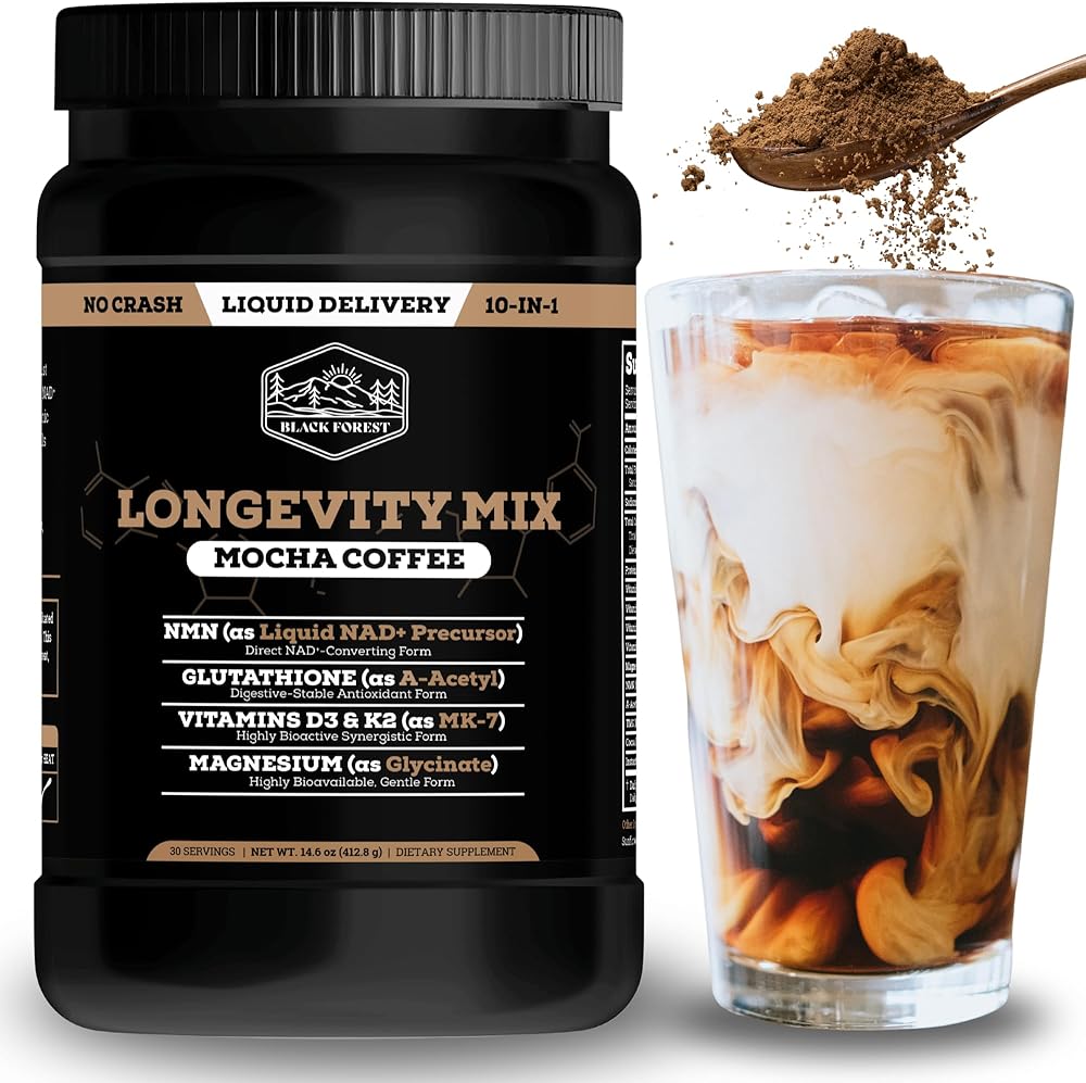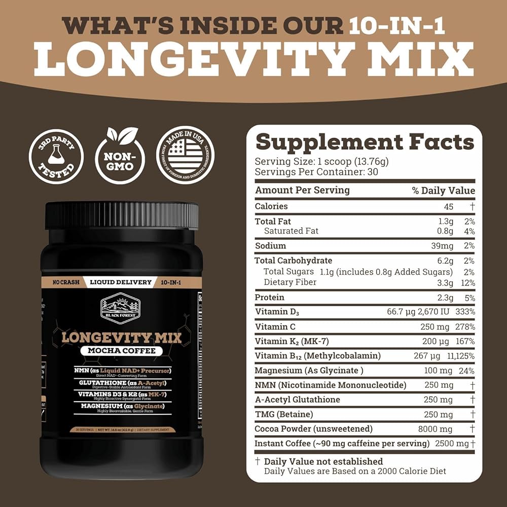 تركيبة تدوم طويلاً 10 في 1 - يجمع مزيج Black Forest Longevity Mix بين NMN 250 mg وA-Acetyl Glutathione 250 mg وTMG 250 mg لدعم الطاقة الخلوية ومسارات NAD+ وعمليات الشيخوخة الصحية. تشتمل كل حصة على مكونات تمت دراستها سريريًا تم تركيبها لتعزيز وظيفة الميتوكوندريا وإزالة السموم والعافية الأيضية من أجل الحيوية اليومية ودعم طول العمر.