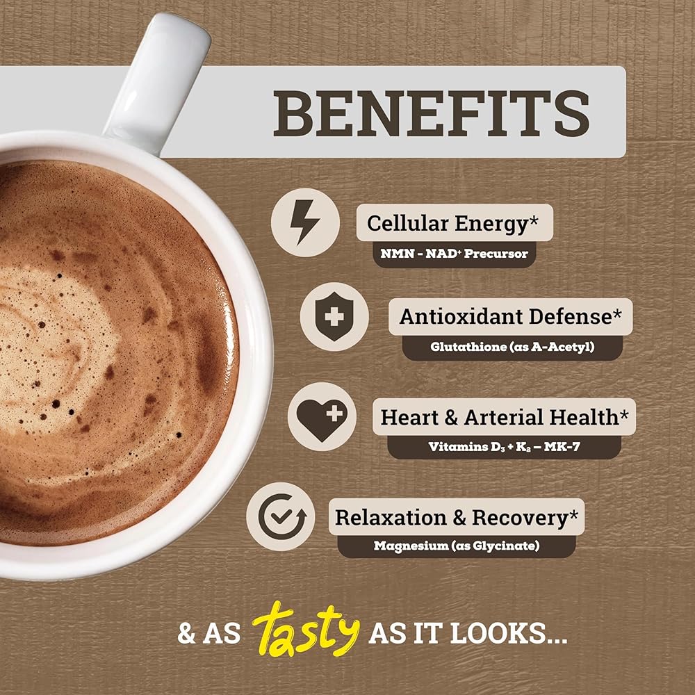 طاقة نظيفة بدون تحطم - تحتوي على 2.5 جم من القهوة الفورية التي توفر حوالي 90 مجم من الكافيين الطبيعي جنبًا إلى جنب مع الثيوبرومين من الكاكاو للحصول على طاقة سلسة ومستدامة. يدعم غليسينات المغنيسيوم وB12 الوضوح العقلي والتركيز وإدارة التوتر مع تعزيز مستويات الطاقة المتوازنة طوال يومك دون توتر أو تعطل في الطاقة.