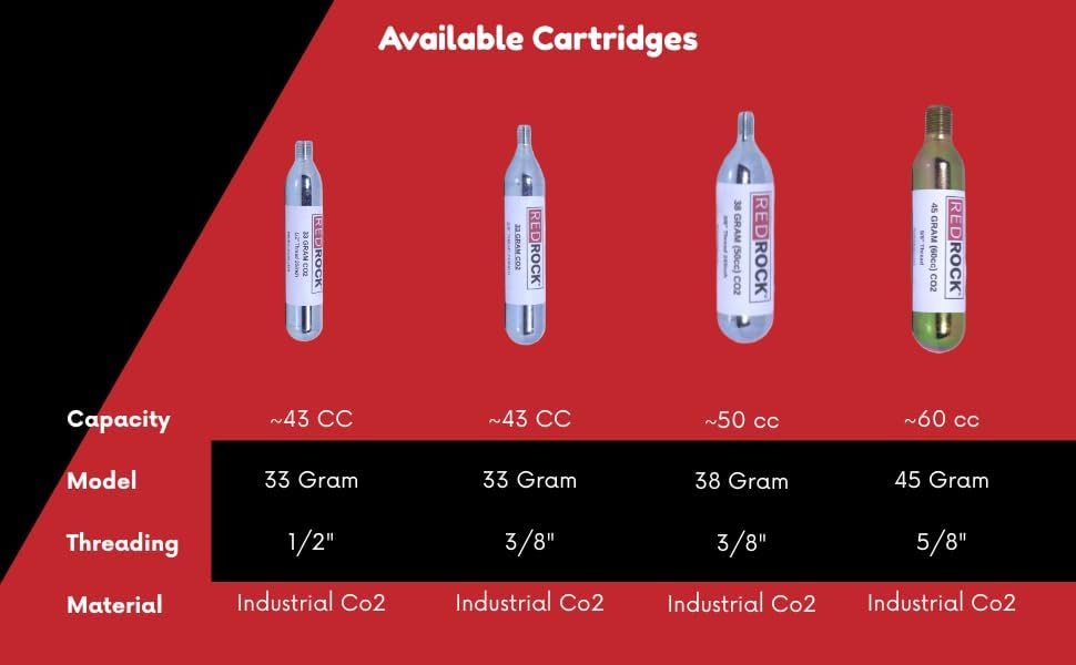 The RedRock 38g CO₂ Cartridge is a high-capacity compressed gas cylinder designed for fast inflation and reliable performance across a range of uses. It features a standard 3/8-24 threaded neck that fits most CO₂ inflator devices and mechanisms – from bike tire inflator heads to inflatable life jacket (PFD) inflators. Each single-use cartridge comes pre-filled with 50cc of pressurized CO₂, providing a quick and portable air source whenever you need it. Whether you're a cyclist re-inflating a flat bicycle tire on the roadside, a boater replacing the CO₂ cylinder in your personal flotation device, or an airsoft enthusiast powering a CO₂-driven air gun, this 38 gram cartridge delivers dependable inflation power. It's an ideal universal CO₂ refill for gear that requires a larger cartridge than the standard 12g or 16g size. Manufactured with durable steel and strict quality control, RedRock 38g CO₂ cartridges are built to perform when you need them most. The cylinders are filled with clean, food-grade CO₂ gas, so they won't introduce dirt or residue into your equipment, preventing clogs in valves or inflators. Each unit is factory-sealed and leak-tested, ensuring the full CO₂ charge is preserved until you puncture it for use. You can safely store these cartridges for long periods in your bike repair kit, emergency roadside bag, or boating gear without worrying about loss of pressure. With its reliable, high-volume gas output and universal compatibility, this 38g threaded CO₂ cartridge is a smart addition to any cyclist's tool kit, inflatable life vest rearming pack, or airsoft gear bag. Due to the nature of this product (pressurized CO₂ cartridges), returns are not accepted for safety and regulatory reasons. Vest Compatability Blue Soup Inflatable Surf Vest (Up/UN models) Blue Soup “First Responder” Surf Vest (2-pull/4-pull) Patagonia PSI Big-Wave Surf Inflation Vest Quiksilver Highline Pro Airlift Surf Vest Stearns / SOSpenders 38 Gram Inflatable PFD (Pro/Std models) Mustang Survival MIT 150 Convertible A/M Inflatable PFD (MD2020)