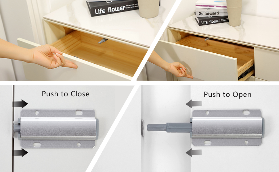 اضغط للفتح أو الإغلاق: تم تصميم مزلاج الدفع Redunest في مكبس زنبركي ومغناطيس قوي، مما يجعل من السهل دفع المزلاج قليلاً للفتح أو الإغلاق. لا تحتاج إلى مقابض أو مقابض، مما يخلق مظهرًا نظيفًا وسلسًا
