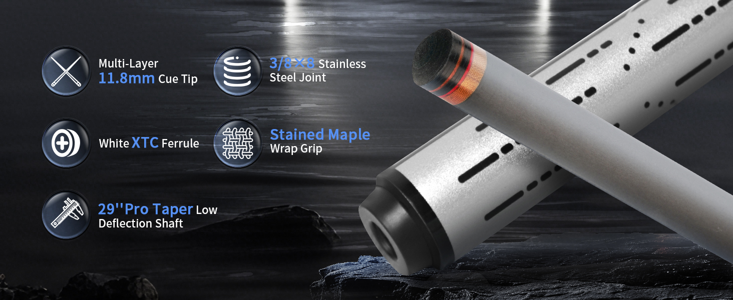 Pro Taper 100% Carbon Fiber Shaft: The Shaft is 29" carbon fiber composite with Hybrid-Conical taper, The carbon fiber shaft reduces shaft deflection, cue ball control ensuring straighter and more powerful every stroke. It is durable and resistant to deformation, It is wood-like feel foremost choice for both competitive and casual gamers