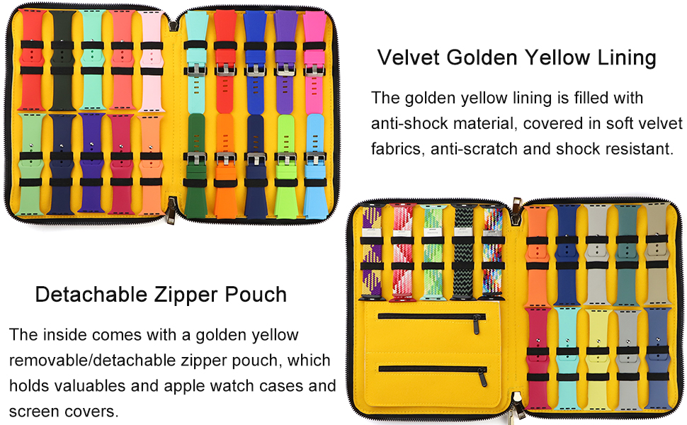 - 【حقيبة بسحاب قابلة للفصل】يأتي الجزء الداخلي مع جراب بسحاب أصفر ذهبي قابل للإزالة/الفصل، والذي يحمل الأشياء الثمينة وحافظات ساعة التفاح وأغطية الشاشة.