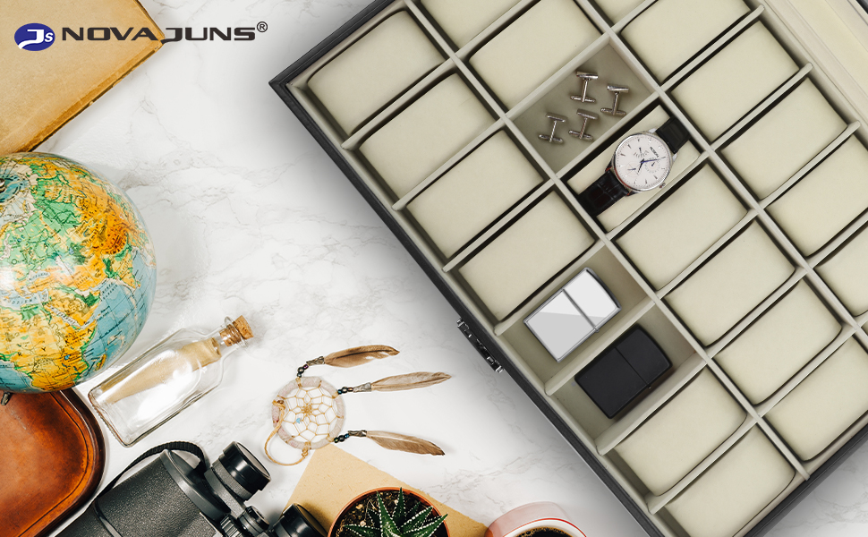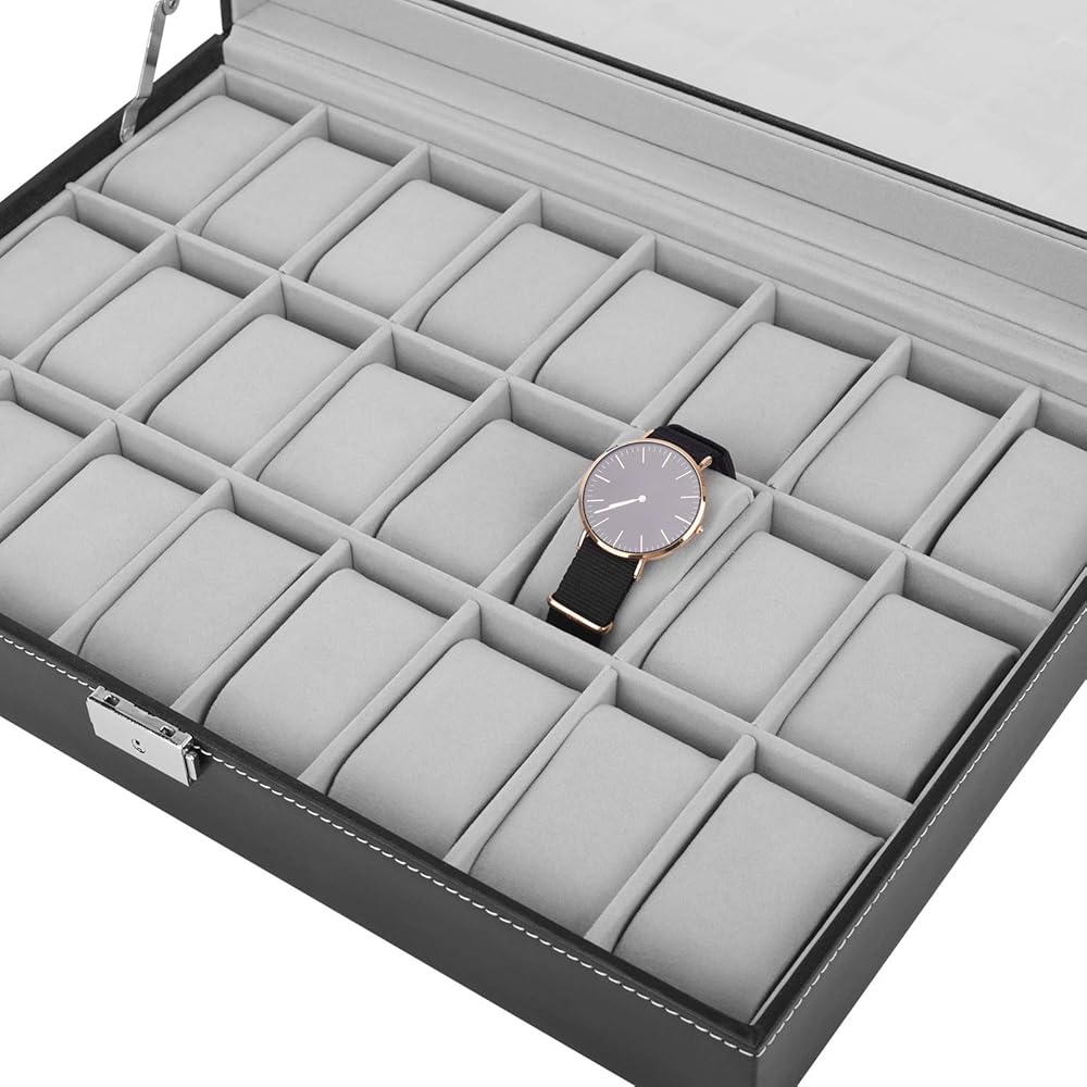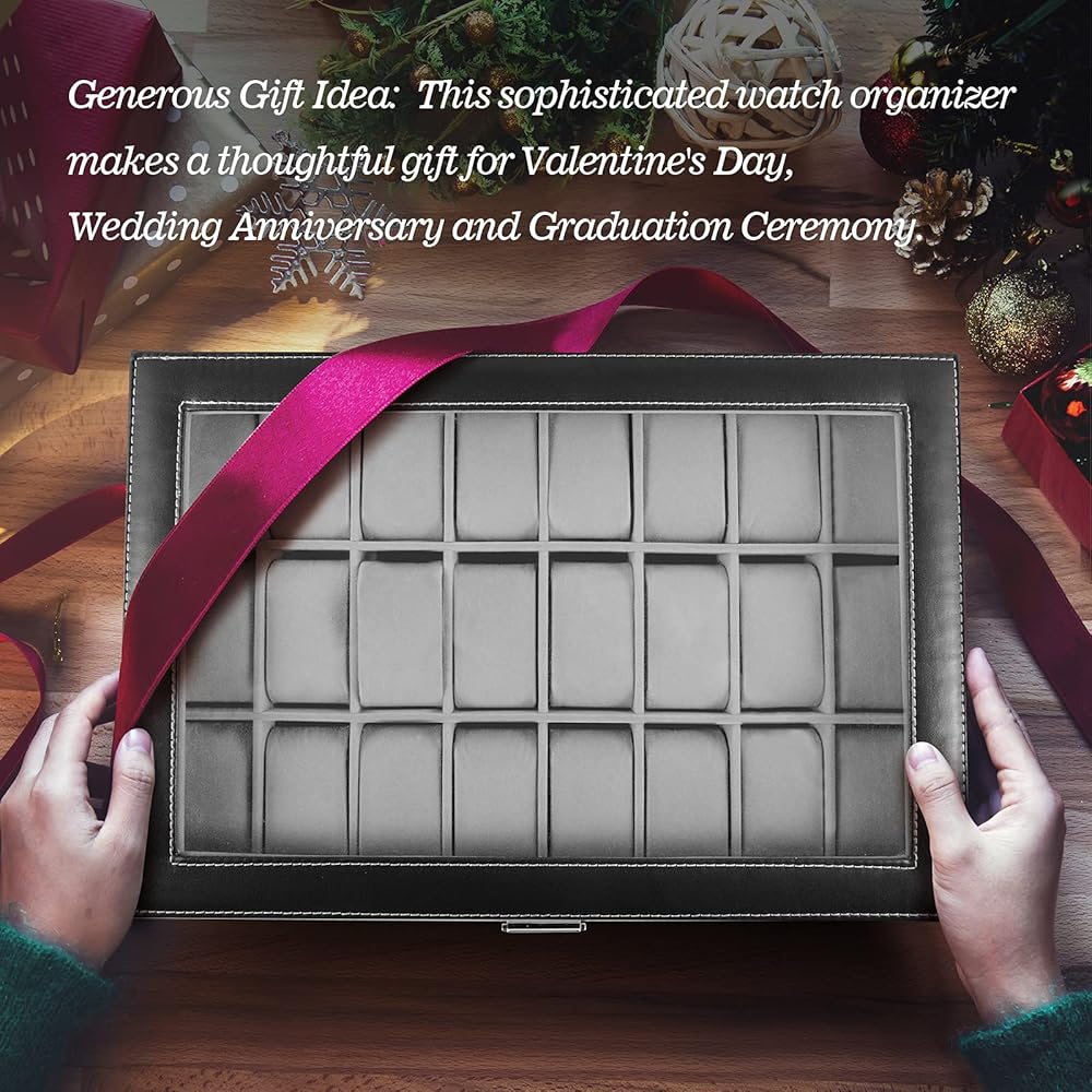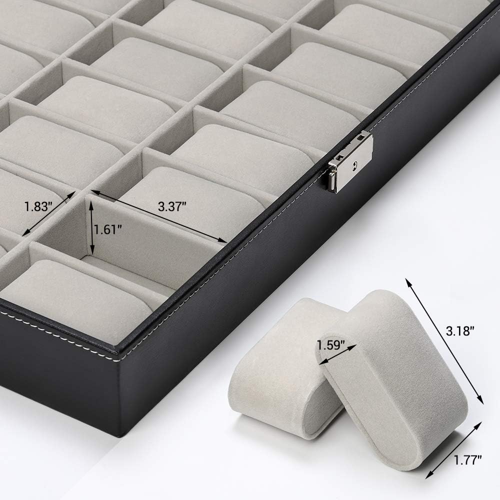 حافظة عرض الساعة ذات 24 فتحة: 16.9 بوصة طول × 11.5 بوصة عرض × 3.35 بوصة ارتفاع (43 × 29.5 × 8.5 سم)؛ مساحة كافية مع 24 وسادة مخملية قابلة للإزالة، مناسبة للساعات ودبابيس الشعر وأزرار الأكمام والدبابيس والمجوهرات والإكسسوارات الأخرى.
