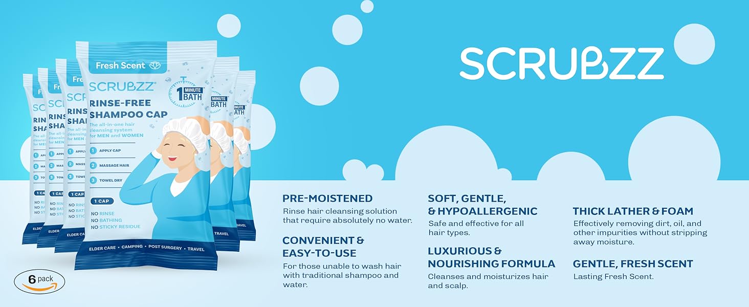 • أغطية الشامبو الخالية من الشطف من سكربز هي محلول تنظيف الشعر مرطب مسبقًا ولا يحتاج إلى شطف ولا يحتاج إلى ماء على الإطلاق