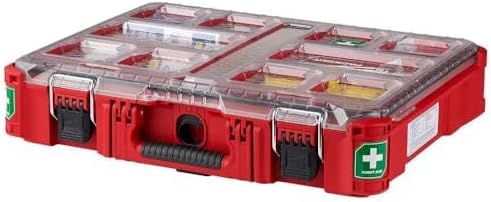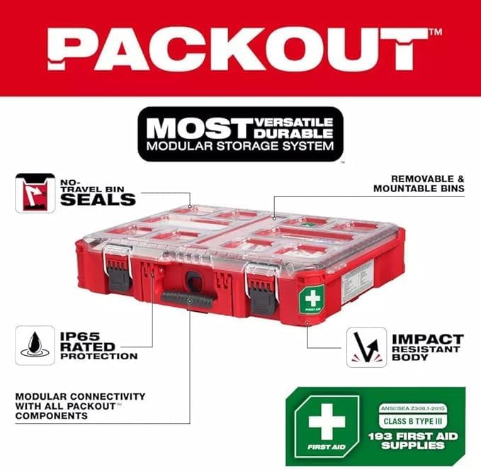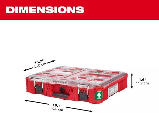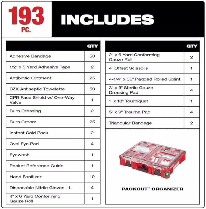 First Aid Kit and Housing, Product Type First Aid Kit and Housing, Application Jobsite, Number of People Served 50, Number of Components 192, Number of Pockets 11, Adhesive Bandages Included (50) Bandages, Documentation Included Pocket Reference Guide, Wound Dressings Included (2) Tapes, (3) Gauze Rolls, (2) Cold Packs, (2) Triangular Bandages, (4) Gauze Dressing Pads, (4) Trauma Pads, (4) Oval Eye Pad, Tourniquet, Splint, Burn Dressing