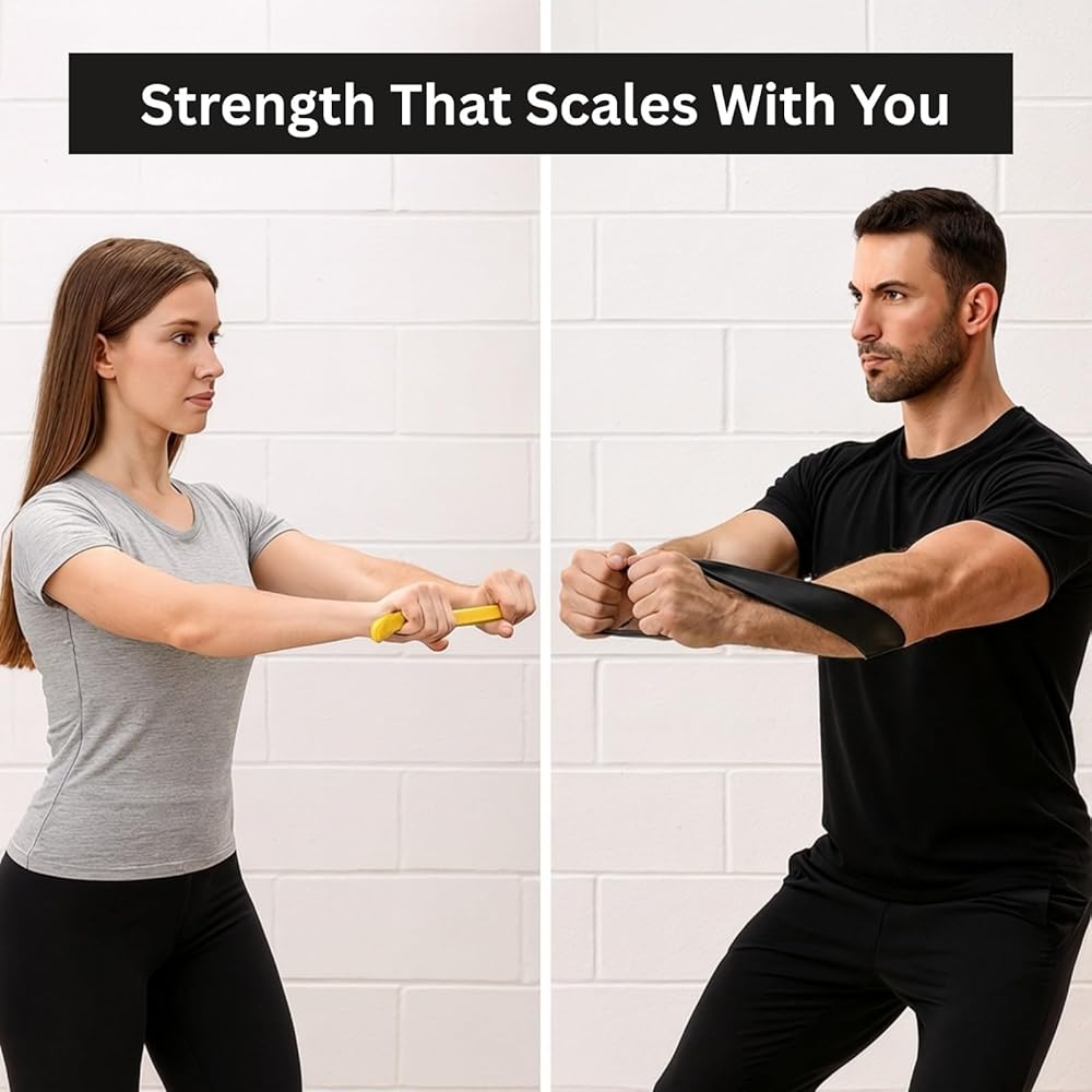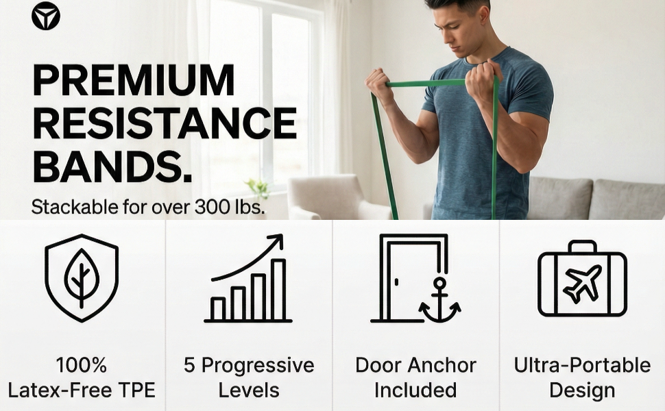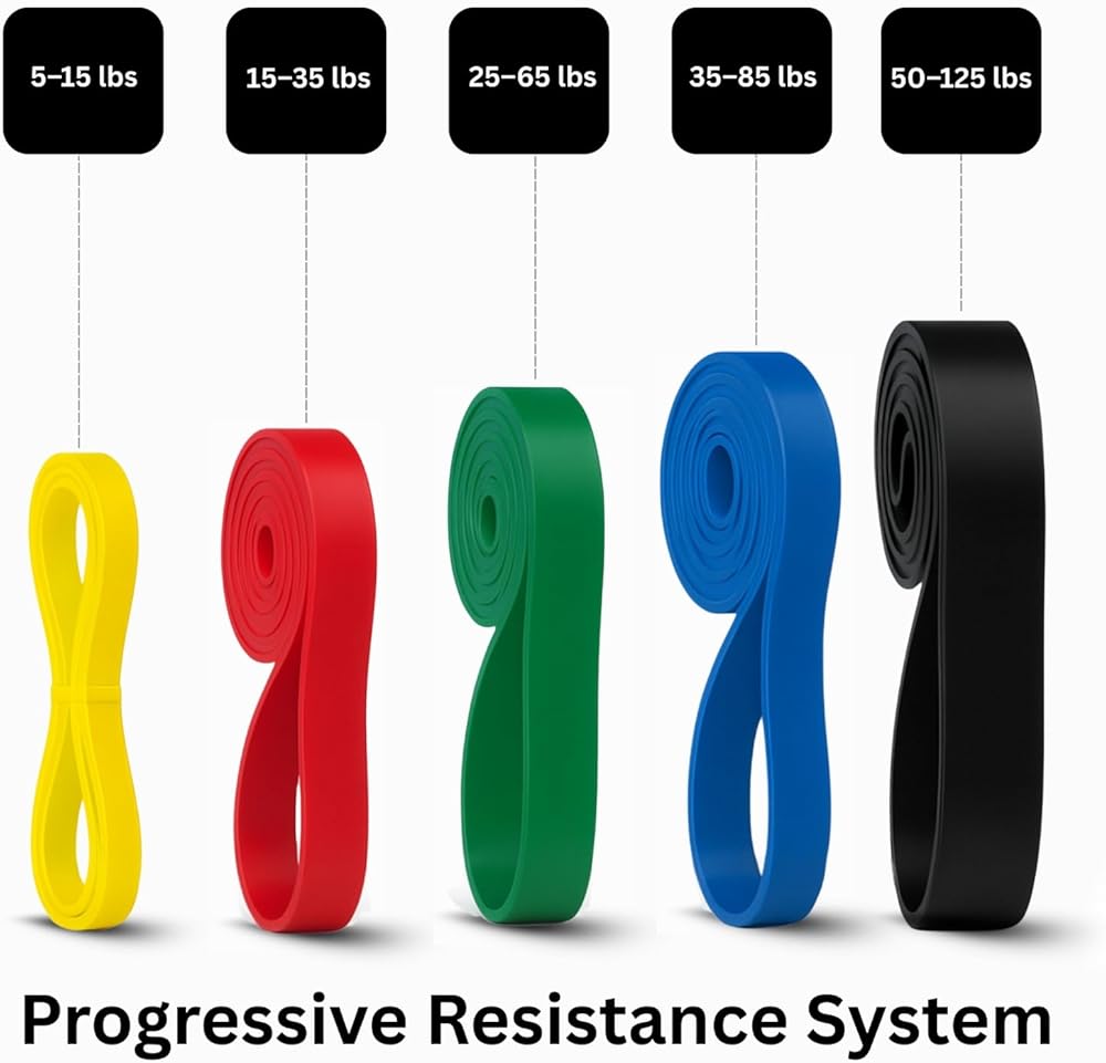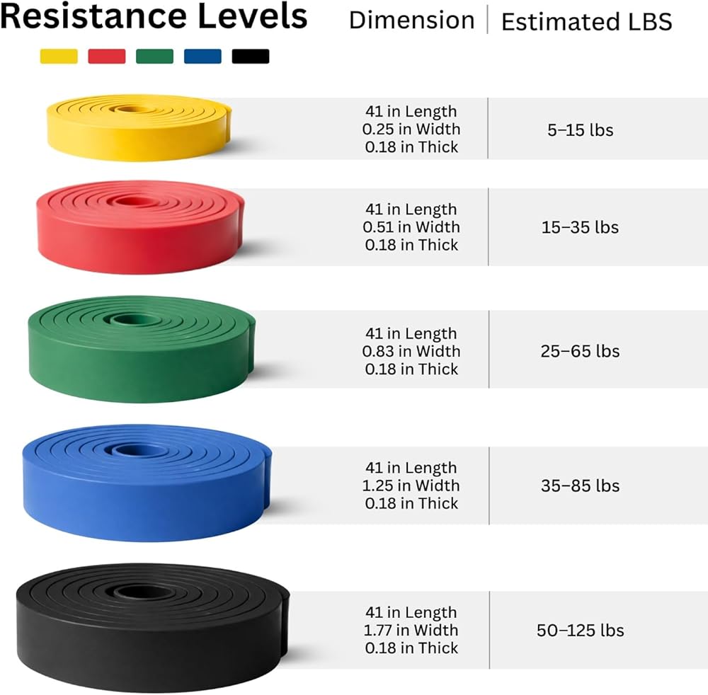 5 مستويات مقاومة قابلة للتكديس (حتى 150 رطلاً) قم بتخصيص شدتك من المبتدئين إلى المتقدمين باستخدام الأربطة بشكل فردي أو تكديسها للحصول على أقصى قدر من المقاومة وتدريبات القوة التقدمية.