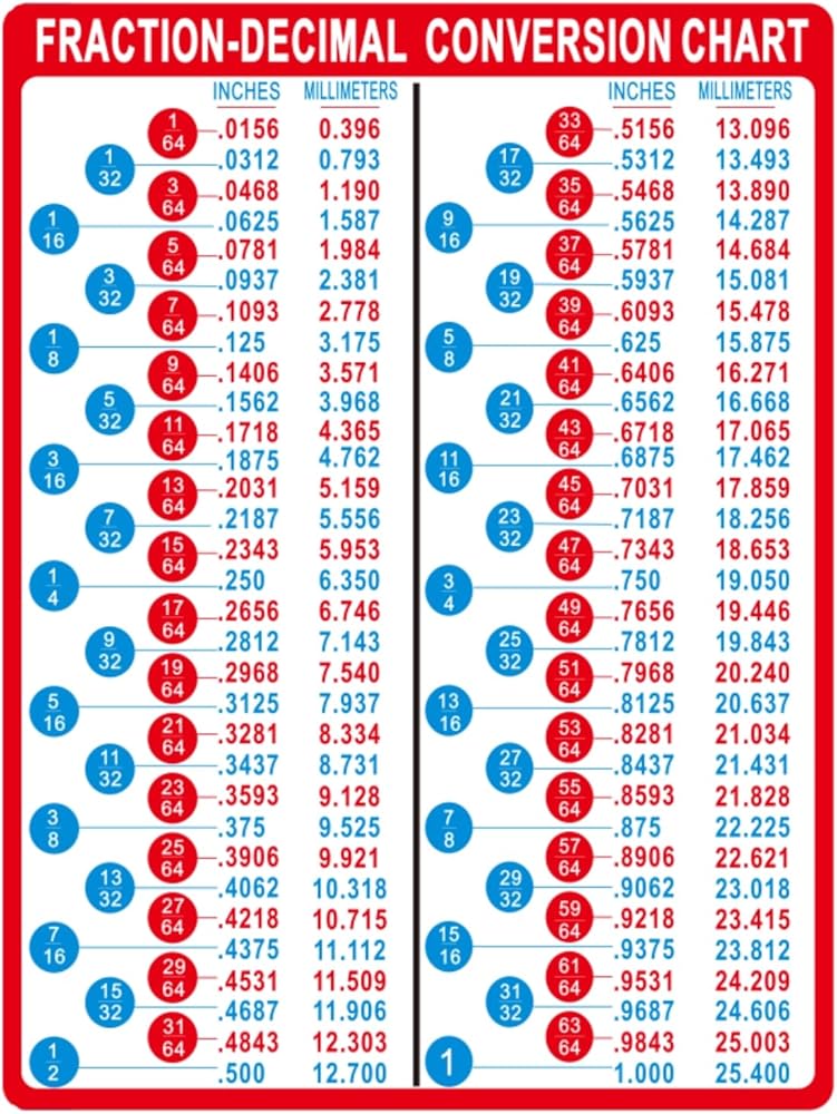 Wide Measurement Range: Displays conversions from small inch fractions up to full inches, plus metric equivalents. This mm to inches conversion chart helps visualize ranges commonly used in machining, repair, and industrial measurement tasks.