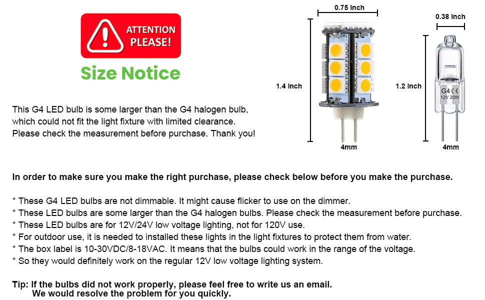سهلة التركيب: التوصيل والتشغيل. من السهل تركيب مصابيح الجهد المنخفض JC G4 LED هذه في مقابس الإضاءة ثنائية الدبوس الموجودة. بالإضافة إلى ذلك، فهي تتمتع بجهد إدخال واسع: AC10-18V/DC10-30V، وهو أمر رائع لـ 12V، 15V، 24V والعديد من مشاريع الإضاءة ذات الجهد المنخفض للمناظر الطبيعية. لذلك لا تحتاج إلى محولات مختلفة لهذه المصابيح.