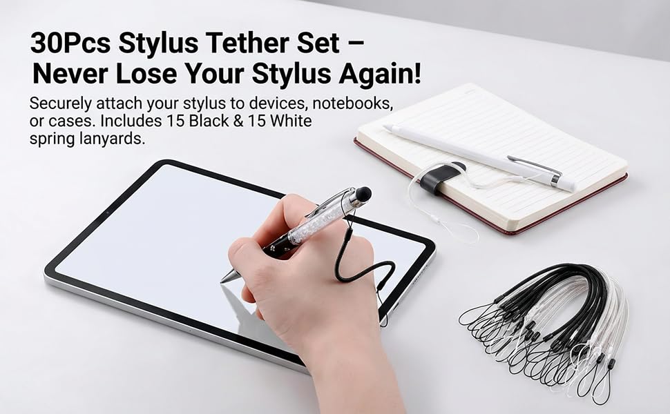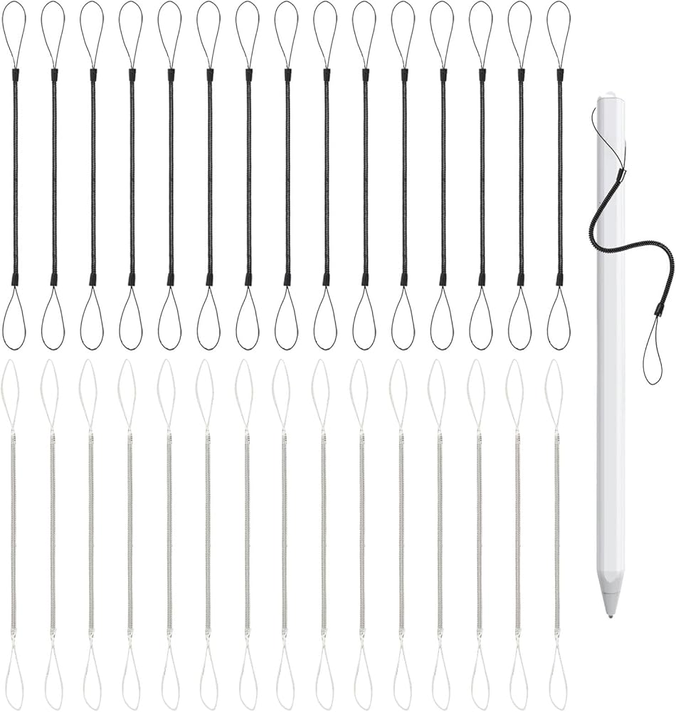 مجموعة حبل مرن مكون من 30 قطعة، ملحق حامل قلم الحافظة وحبل القلم للكمبيوتر اللوحي أو لوحة الكتابة، سلسلة سلك ملف القلم من مادة البولي يوريثان، بطول 9.8 بوصة يمتد إلى 35.4 بوصة، أسود وشفاف