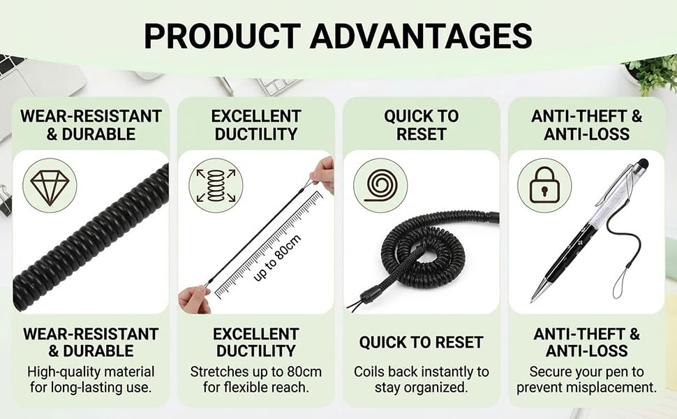 مادة البولي يوريثان المتينة: مصنوعة من البولي يوريثان عالي الجودة، تتميز سلاسل سلك لفائف القلم هذه بأنها مرنة وقوية ومقاومة للكسر أو التشوه. مثالي للكتابة اليومية أو توقيع المستندات أو الرسم على الأجهزة اللوحية