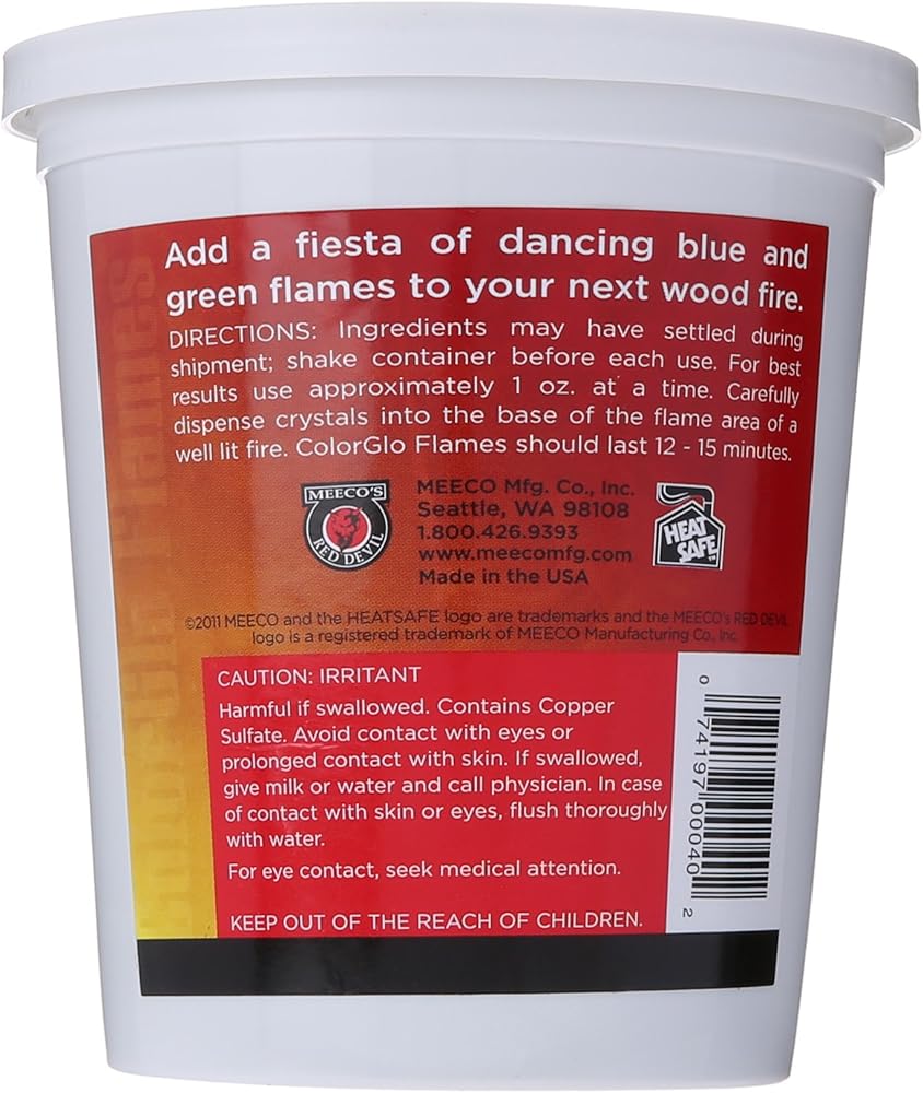 Tub of color crystals for rainbow color effect in fireplaces, firepits, woodstoves or campfires. The crystals will burn for about 10 minutes. The product is manufactured in United States.