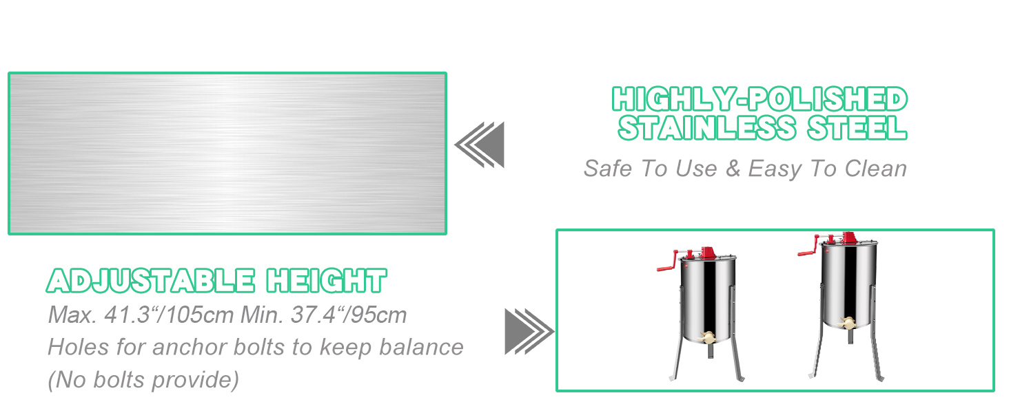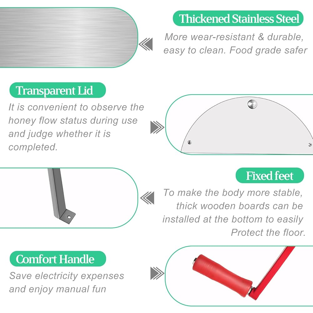الجسم الرئيسي لمستخرج العسل المطور مصنوع من الفولاذ المقاوم للصدأ السميك الآمن غذائيًا دون تشوه، ولا تسرب العسل، وليس من السهل الصدأ والتآكل؛ تتمتع شعاع الفولاذ المقاوم للصدأ بقدرة تحمل قوية، وقوية ومتينة، والمواد الفولاذية المصبوبة قوية جدًا؛ المحمل السميك المقوى لا يحتوي على أسنان، أسنان مستمرة، متين للغاية.