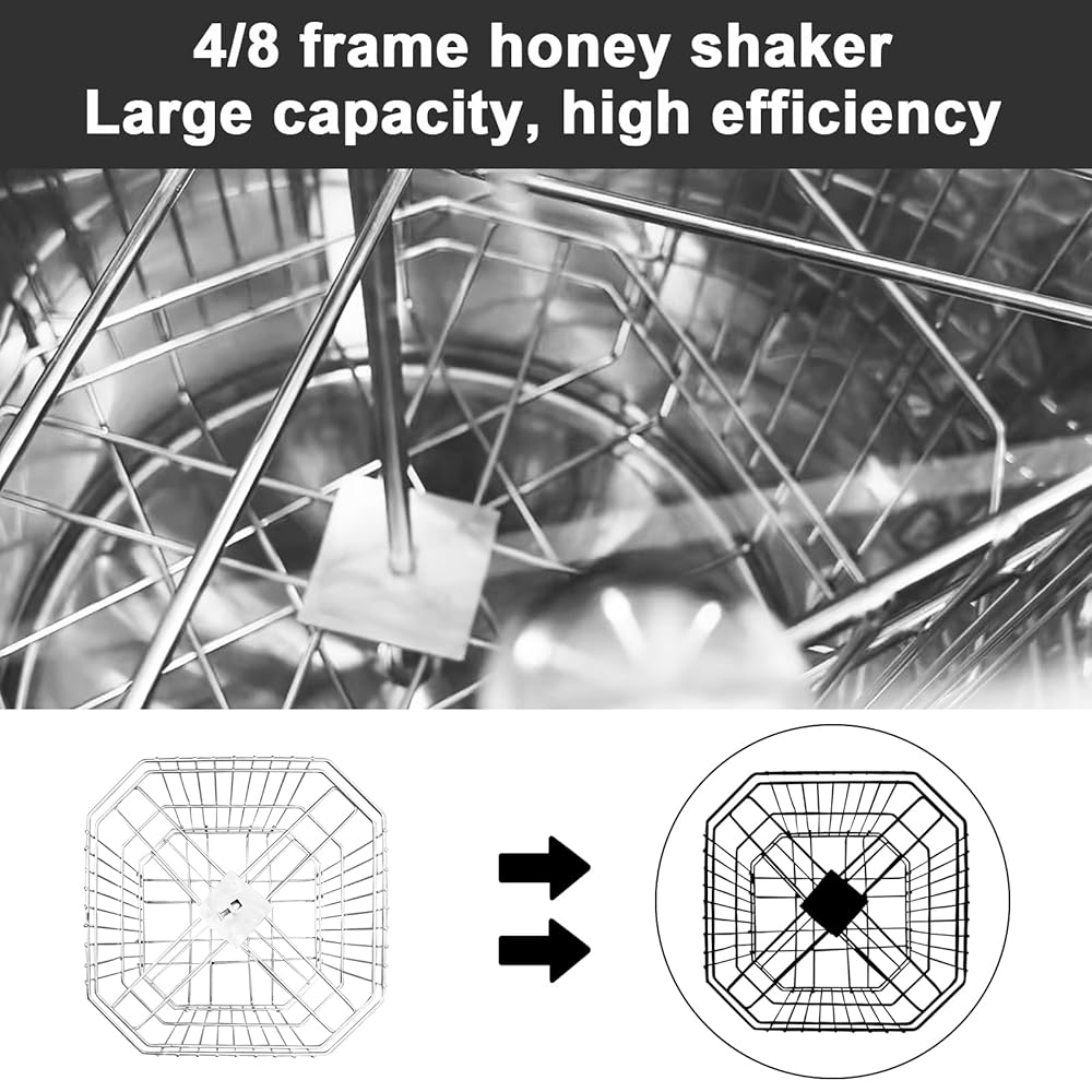 يمكن للسلة الداخلية أن تستوعب 4 إطارات عميقة قياسية أو 8 إطارات متوسطة أو ضحلة في نفس الوقت. السلة الداخلية مستديرة قليلاً لمنع الخلية من الكسر. التروس المغلقة على الإطارات لا تلوث العسل. الجزء العلوي مصنوع من زجاج شبكي شفاف، مما يسهل الرؤية ويمنع أيضًا دخول الغبار والجزيئات الأخرى أثناء عملية استخلاص العسل.