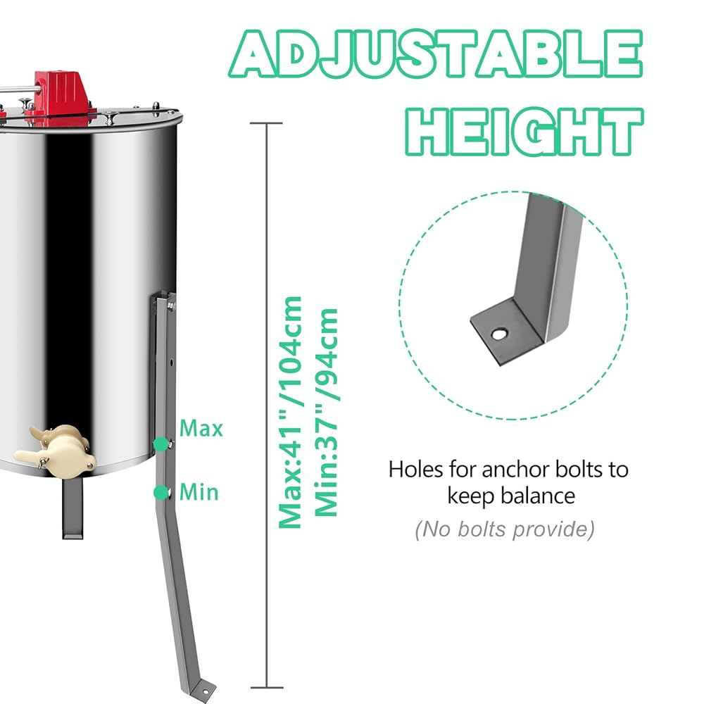 ثلاثة أرجل قابلة للتعديل تسمح بوضع دلاء بأحجام مختلفة تحت المستخرج. يمكن تثبيت الأرجل المصنوعة من الفولاذ المقاوم للصدأ على الأرض ورفع الأسطوانة، أو يمكن إزالة الأرجل لاستخدامها على سطح الطاولة. يقوم الكرنك المعدني القوي بتدوير السلال بسلاسة وكفاءة.