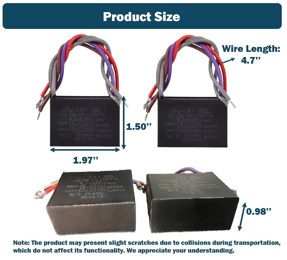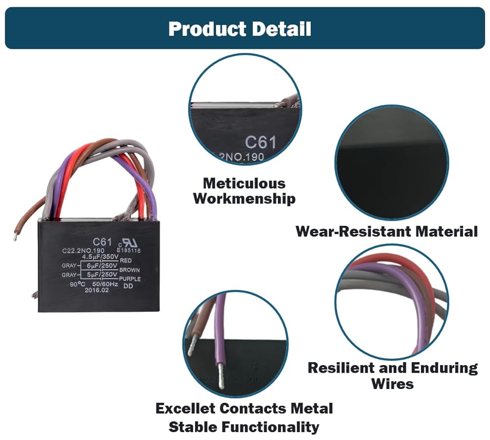 Rated at 4.5uF+6uF+5uF and 300V/350V+250V+250VAC, with 5 Wires, Building a Stable Functionality Note: Some product casing display CBB61/300V due to packaging upgrades, but the effectacy and performance is exactly the same with the old packaging products. Thank you for your understanding.