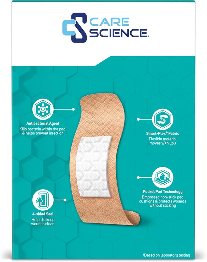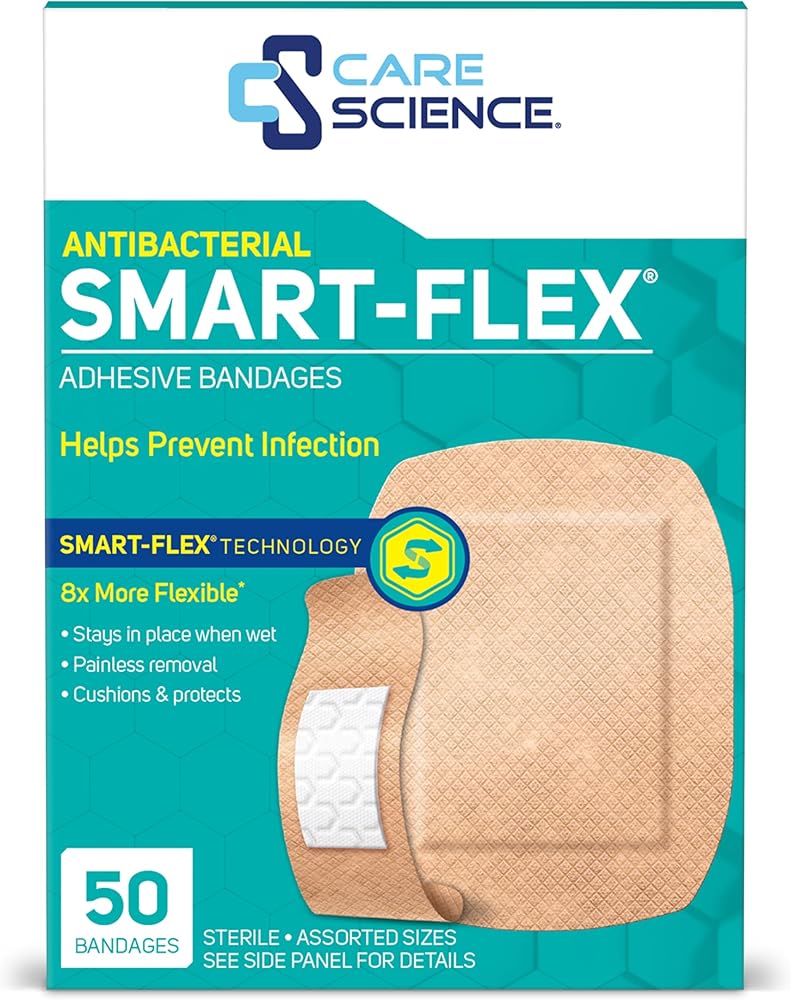 Care Science Smart Flex Performance Fabric Bandages are flexible, assorted-size bandages featuring a 4-sided seal to for minor cuts, scrapes, and burns.
