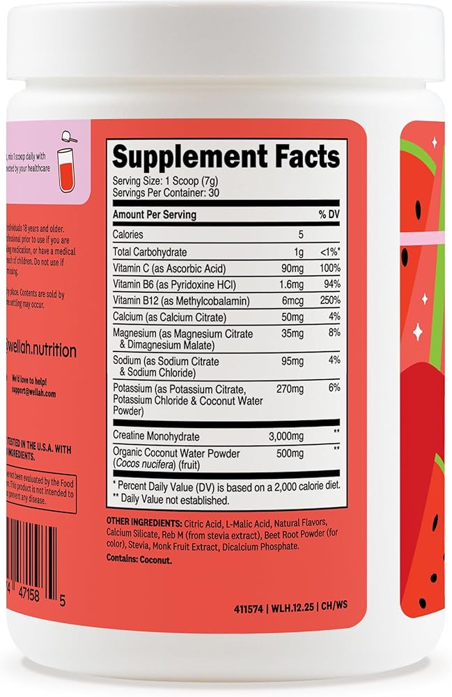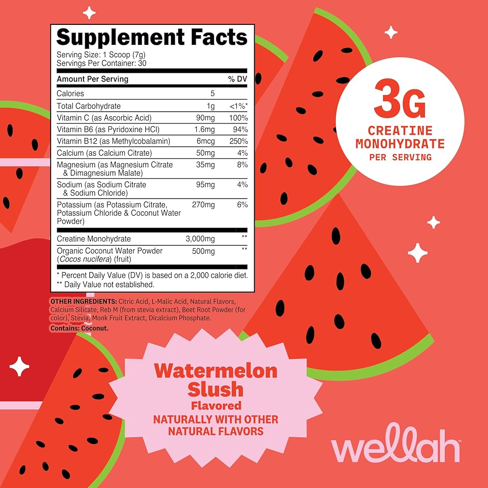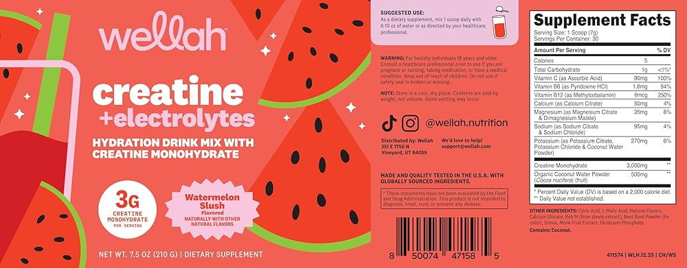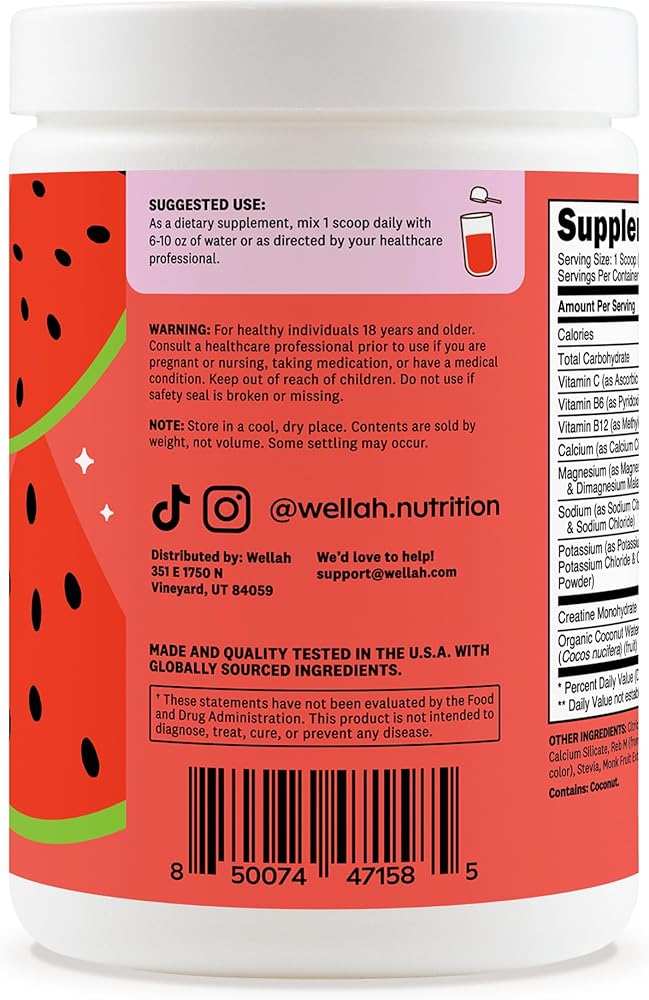 Upgrade your hydration and performance with Wellah Creatine + Electrolytes Powder in Watermelon Slush. This refreshing electrolyte drink delivers 3g of creatine monohydrate per serving to support strength, power, and overall performance—perfect for training days or active lifestyles. Designed for easy daily use, this refreshing formula mixes smoothly and helps replace key electrolytes lost during exercise, long days, or intense training sessions. With 30 servings per container, it's a simple way to support both performance and hydration in one delicious drink. Finished with a crisp Watermelon Slush flavor, this light and juicy drink turns daily hydration into something you'll actually look forward to.