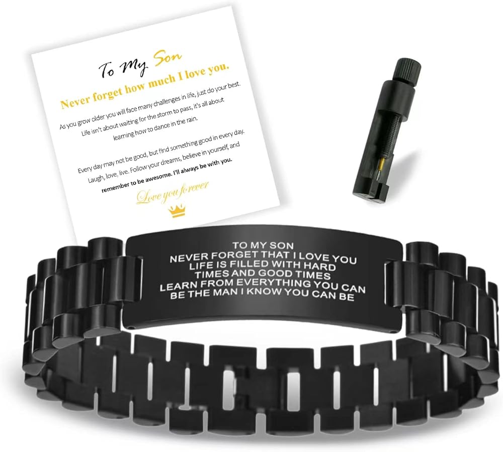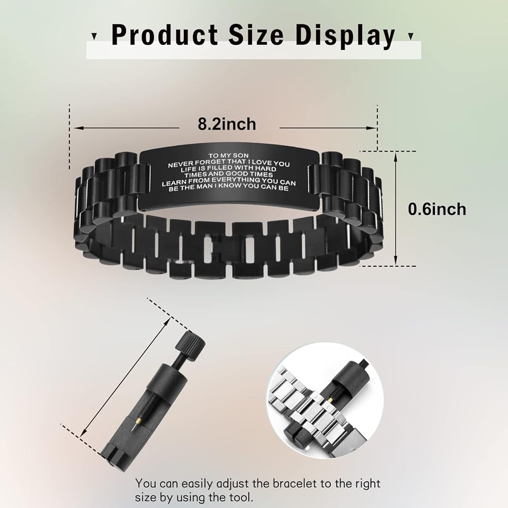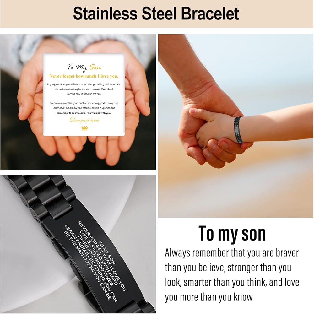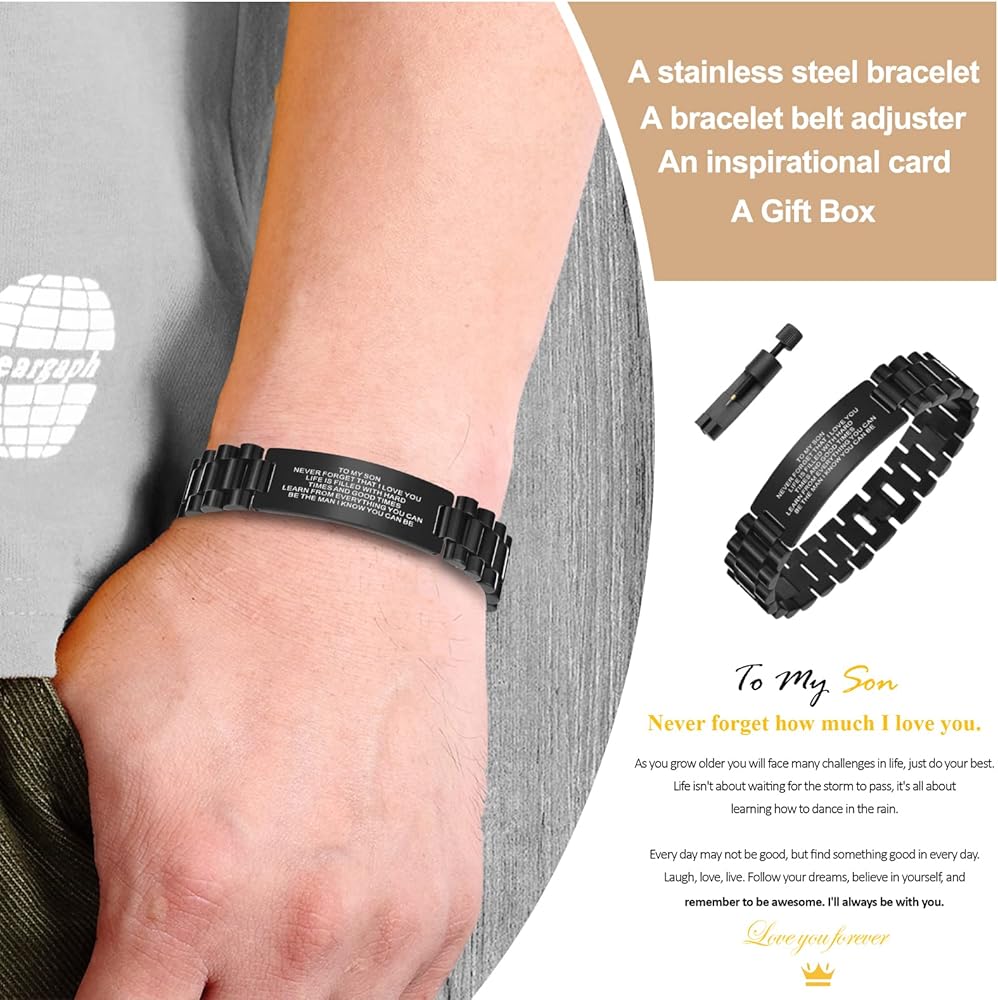 【تحتوي العبوة على: سوار مخصص لابنك، أداة تعديل السوار، بطاقة دافئة لابنك، لا تنس أبدًا أنني أحبك، الحياة مليئة بالصلابة، لن تخسر أبدًا، فقط انطلق للأمام