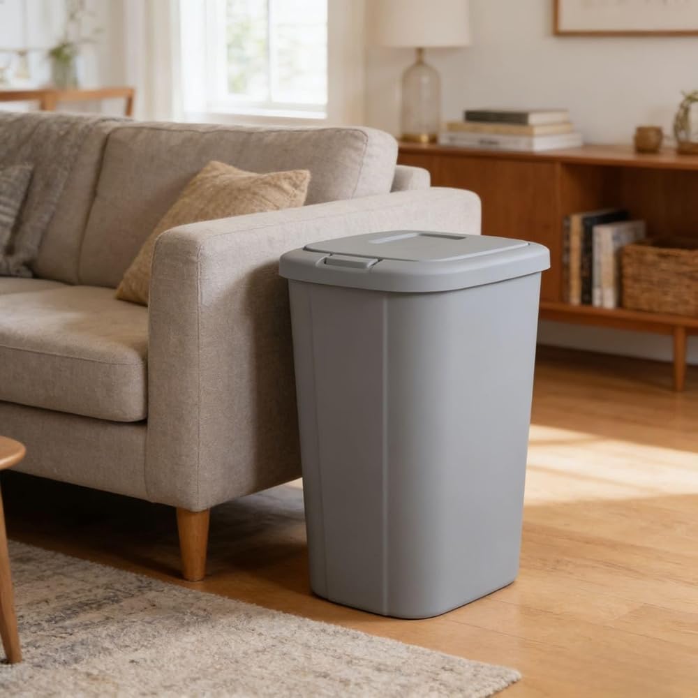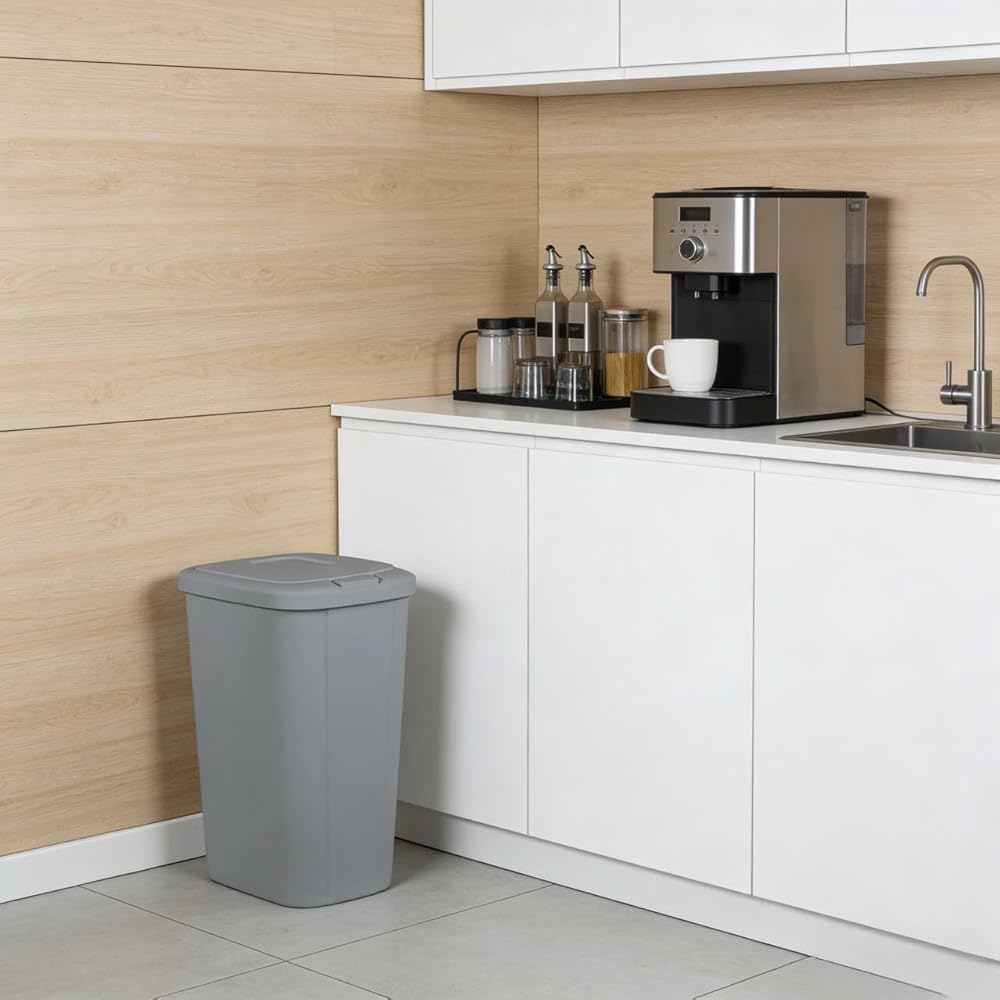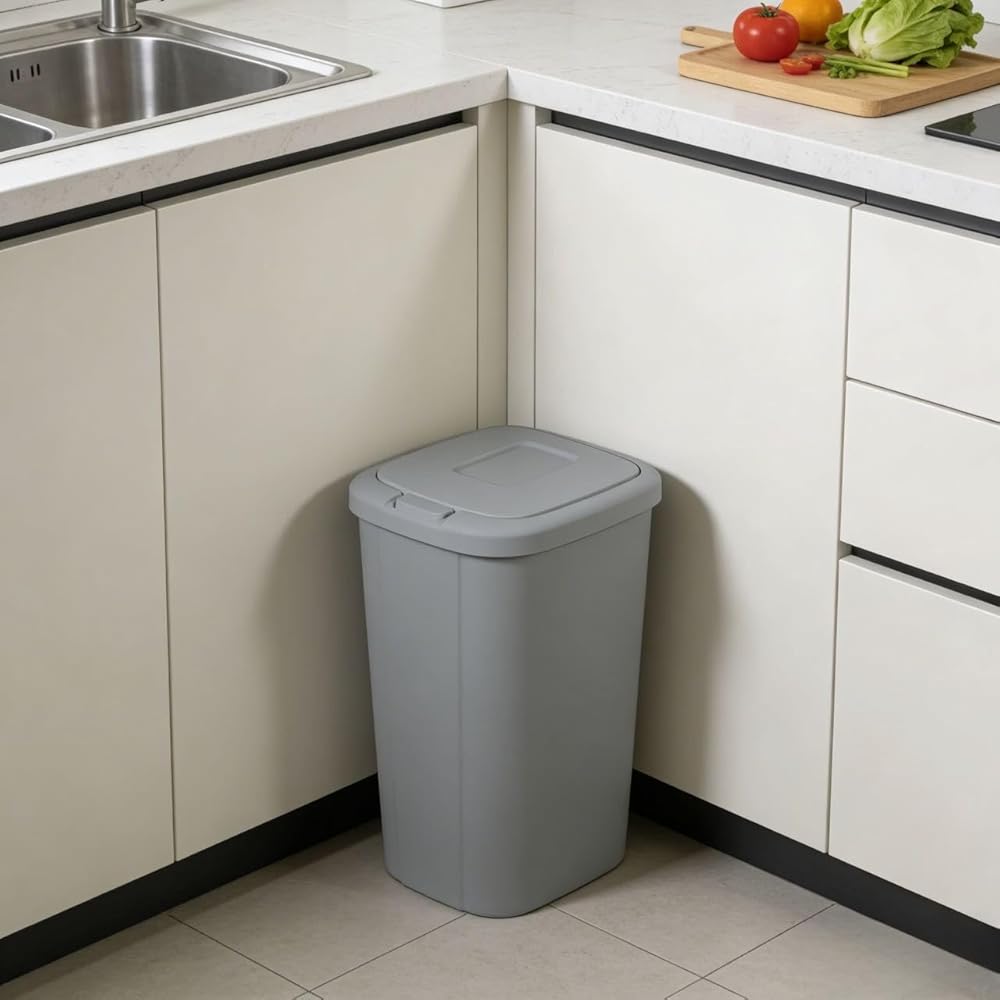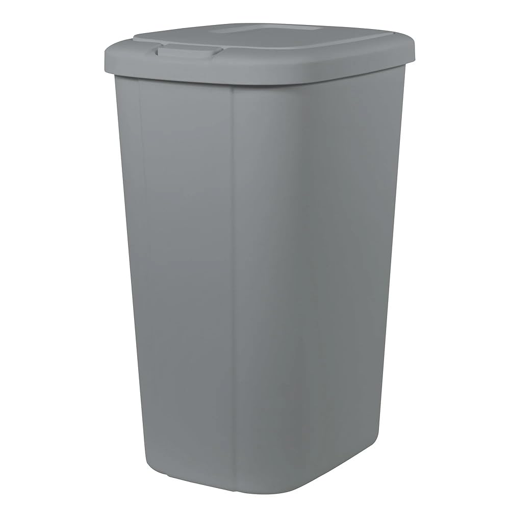 The touch lid plastic kitchen trash can in elevated cement grey has everything you need and nothing you don?t. The slim profile allows you to neatly tuck the bin away while still offering a large 13.3-gallon capacity. The spring loaded lid pops open with the simple touch of a button and clicks securely closed, helping to reduce odor. Plus, the trash bin is made of durable plastic to withstand daily use and can be easily wiped down when needed. This trash can will look great in your kitchen for years to come. The best part is, it fits a standard 13-gallon trash bag perfectly!