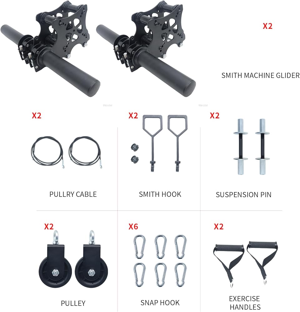 • 【Included Components】2 × smith machine glider / 2 × barbell / 2 × pulley cable / 2 × pulley / 2 × exercise handles / 6 × snap hook / 2 × smith hook / 2 × suspension pin. Note: In addition to all the tools mentioned above, the other exercise tools in the picture are only for display purposes.