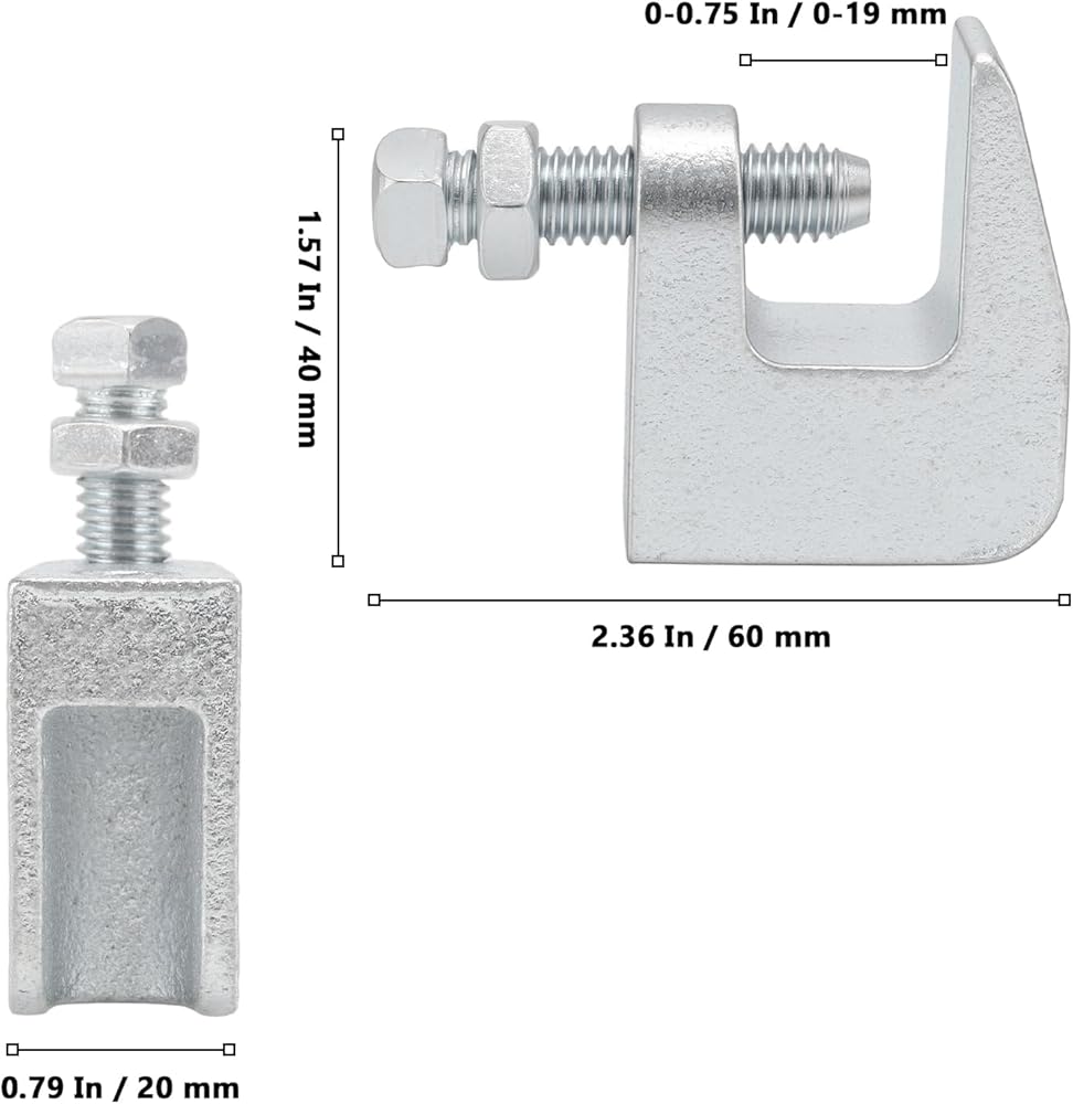 الأبعاد: تحتوي أداة تثبيت المشبك ذات العارضة العلوية على فكين بحد أقصى للفتحة 3/4 بوصة وأحجام فتحة ملولبة 3/8 بوصة، ويمكن استخدامها جنبًا إلى جنب مع شماعات القناة وحلقات الربط والأنابيب.