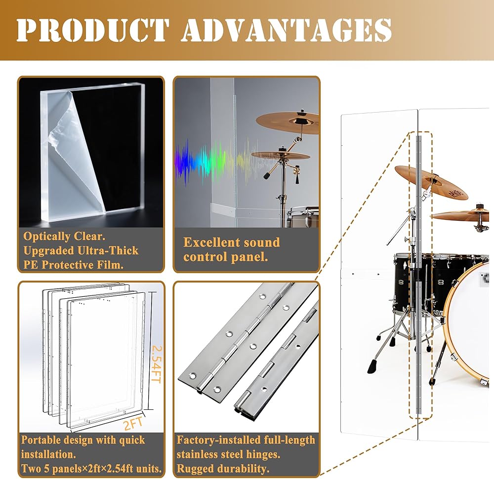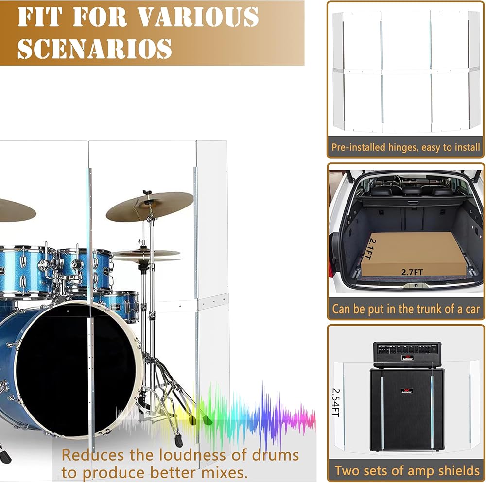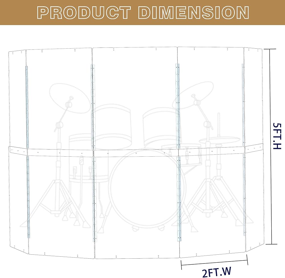 Introducing our versatile Drum Shield, designed to meet the needs of drummers who own a drum set and require a portable sound solution. This innovative shield features an up and down combination design, allowing you to assemble it into various configurations. Whether you need a 5 panels 2ft x 5ft acrylic shield, 10 panels 2ft x 2.54ft acrylic shield, this drum shield has got you covered.Crafted with durability in mind, each piece of the Drum Shield is connected by two sturdy 2ft metal hinges. These pre-installed metal hinges make installation a breeze, requiring you to only complete the top and bottom combination and attach the hinges. This ensures a secure and stable structure, allowing you to focus on your drumming without any worries.Perfect for both live performances and home practice sessions, our Drum Shield effectively blocks out excess sound, providing you with a clear and focused audio experience. The high-quality acrylic material used in the shield ensures optimum sound transparency, allowing you to hear every beat with precision.Not only does our Drum Shield deliver exceptional sound control, but it also offers convenience. Its easy-to-assemble and portable design allows for effortless storage and transportation. Whether you're gigging at different venues or simply practicing at home, this drum shield is your reliable companion.Invest in our Drum Shield today and take control of your sound. Enhance your drumming experience with this versatile, durable, and portable shield. Experience the difference for yourself.