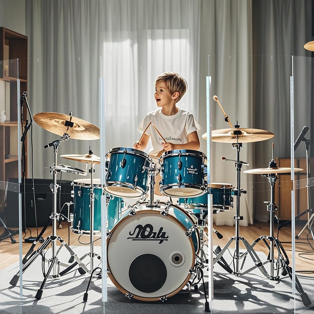 【Smart Acoustic System】Five 2ft x 5ft premium plexiglass panels paired create a 7.5dB active noise reduction zone. Effectively isolates high-frequency cymbal noise while preserving kick drum resonance, delivering studio-quality sound control.