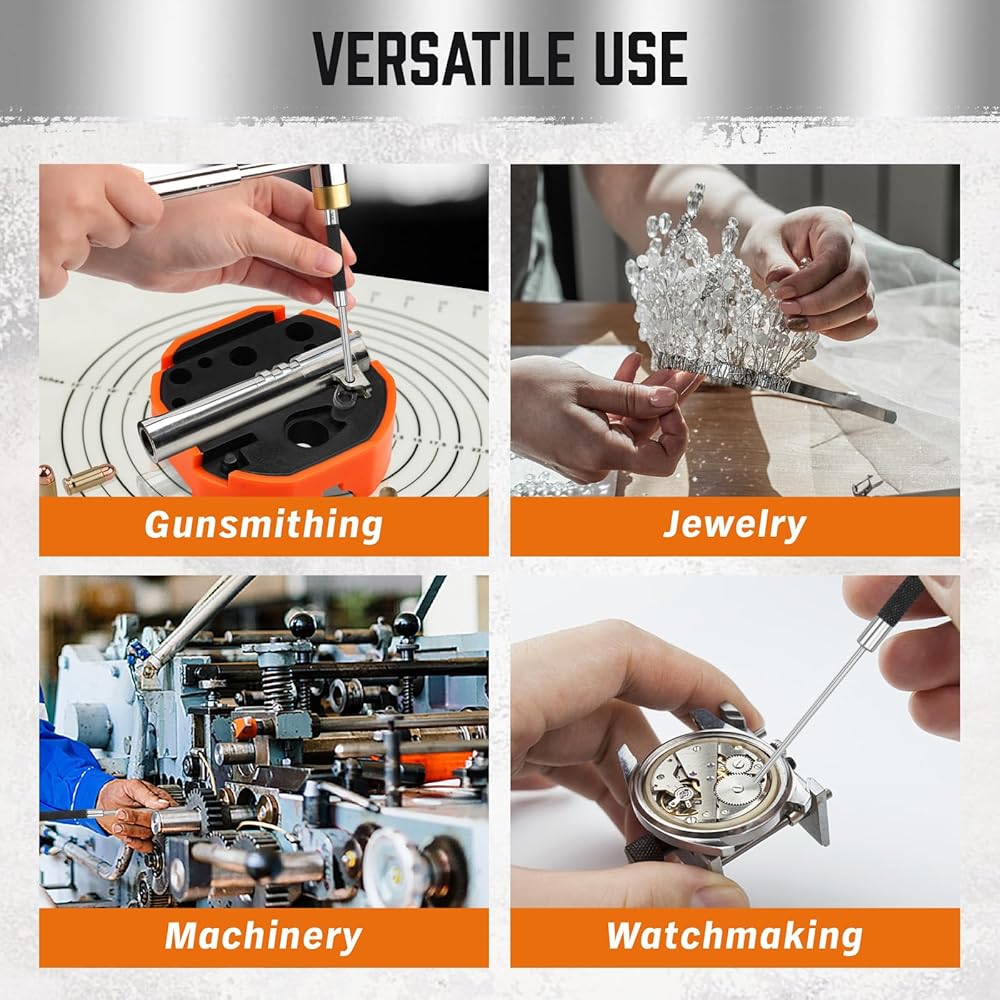 • [أداة إصلاح وإصلاح متعددة الاستخدامات] مناسبة لصانعي الأسلحة وصانعي الساعات والمجوهرات ومحترفي الأعمال اليدوية. تعتبر مجموعة الدبابيس هذه مثالية لإزالة وتثبيت الدبابيس والمسامير والأجزاء الأخرى التي يتم الضغط عليها على الأسلحة النارية والساعات والمكونات الميكانيكية