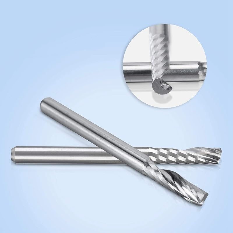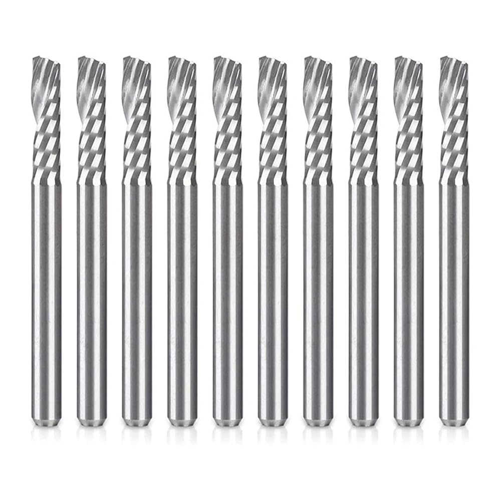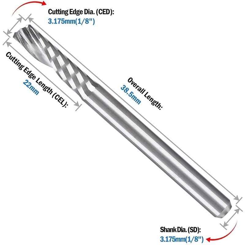 10pcs O Flute Single Flute Spiral Solid Carbide End Millshank diameter (SD): 1/8 inch (3.175mm); cutting edge length (CEL)/flute length: 22mm; overall length (OAL): 38.5mmMaterial: tungsten steelPackage contents: 10*spiral upcut bits