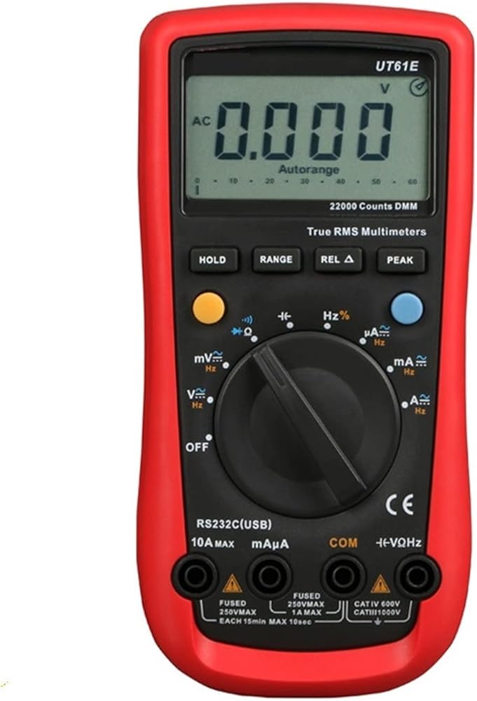 1. The signal generator is small in size, has many functions, easy to operate and easy to carry.2. The key layout is reasonable, all functions have independent corresponding keys, easy to operate.3. Built-in battery, low power consumption, long standby time.Features1. Auto range2. MAX/MIN/REL mode3. RS-232 and USB interface4. Analog bar graph5. Low battery indication6. True RMS 7. Peak value/hold8. Diode/continuity buzzer9. Data hold10. Input protectionSpecifications Range UT61E voltage (V) 1000V (0.1%+2) AC voltage (V) 750V (0.8%+10) current (A) 10A (0.5%+10) AC current (A) 10A (0.8%+10) Resistance () 220M (0.5%+10) Capacitance (F) 220mF (3%+5) Frequency (Hz) 10Hz220MHz (0.01%+5) Features Display count 22000 Bandwidth (Hz) 45Hz10kHz Duty cycle 0.1%99.9% General Characteristics Power 9V battery (6F22) Display 65mm x 43mm Product color Red and grey Product net weight 370g Product size 180mm x 87mm x 47mm Notice please: battery no include!