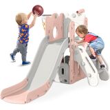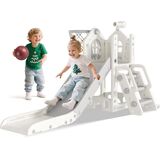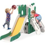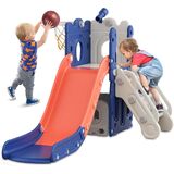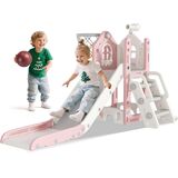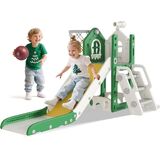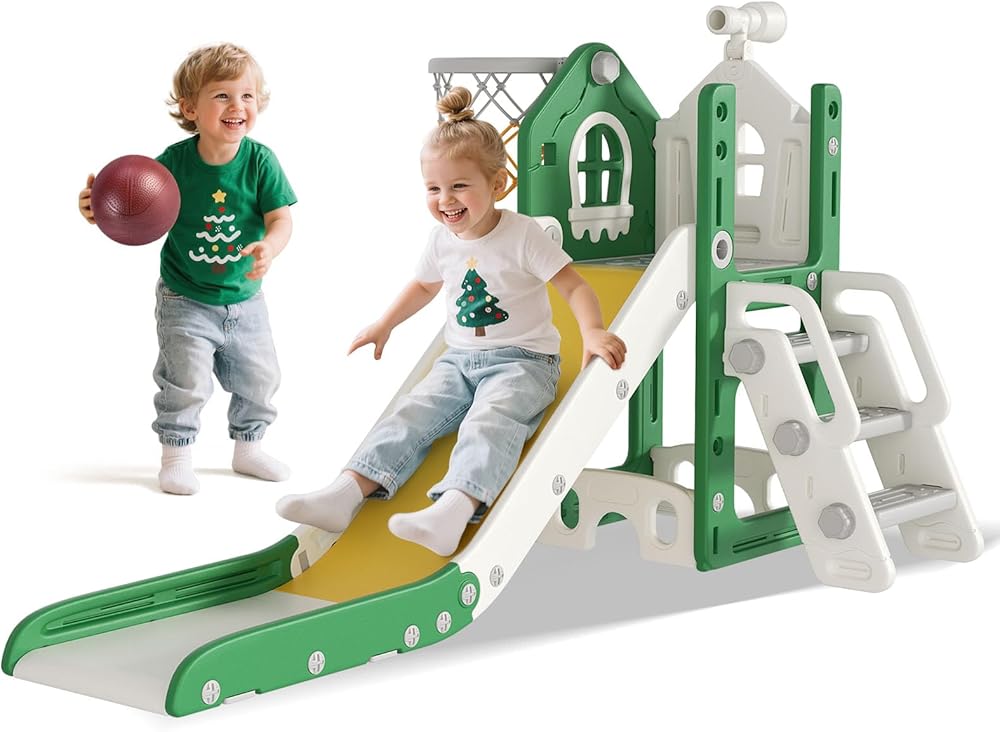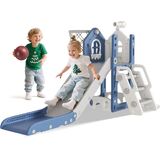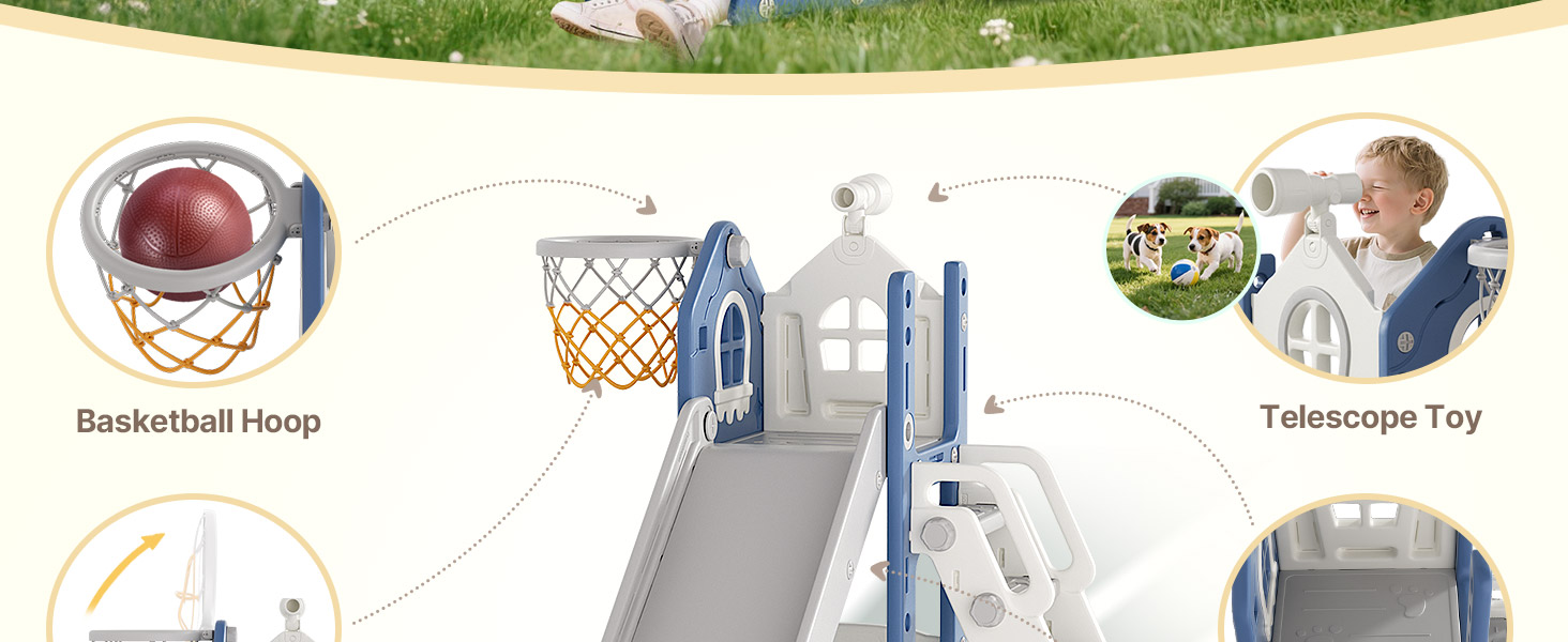 مجموعة لعب للأطفال 6 في 1 - تتميز شريحة الأطفال هذه بأربعة مناطق للأنشطة، بما في ذلك المتسلق والزحليقة والاختباء وحلقة كرة السلة ولعبة التلسكوب، بالإضافة إلى مساحة تخزين. يساعد التسلق ولعب كرة السلة والانزلاق الأطفال الصغار على تطوير المهارات الحركية والتوازن والتنسيق.
