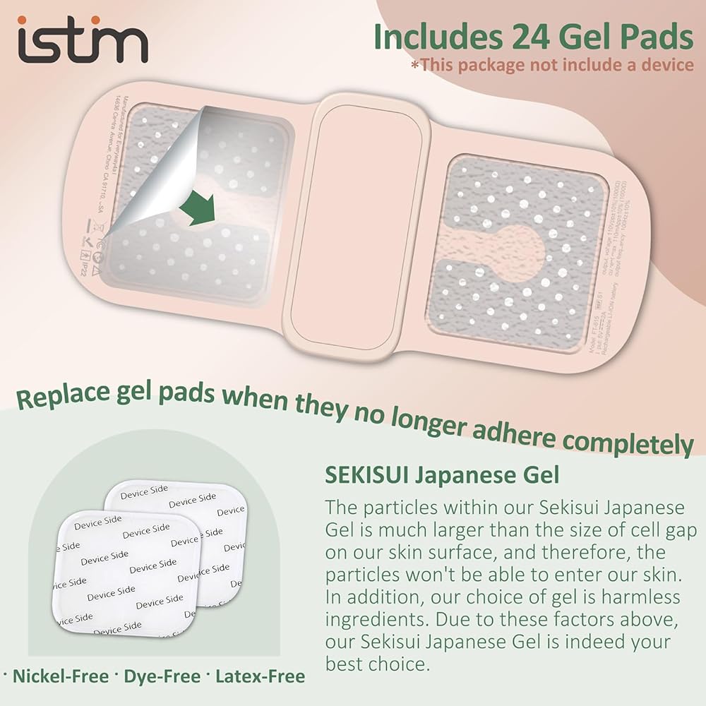 وسادات جل كهربائية من iStim S1 لوحدة TENS اللاسلكية iStim S1 - وسادات جل يابانية لتخفيف آلام الدورة الشهرية والظهر، متوافقة مع مدلك الحرارة iStim S1 لتشنجات الفترة، إجمالي 24 قطعة (6 عبوات)