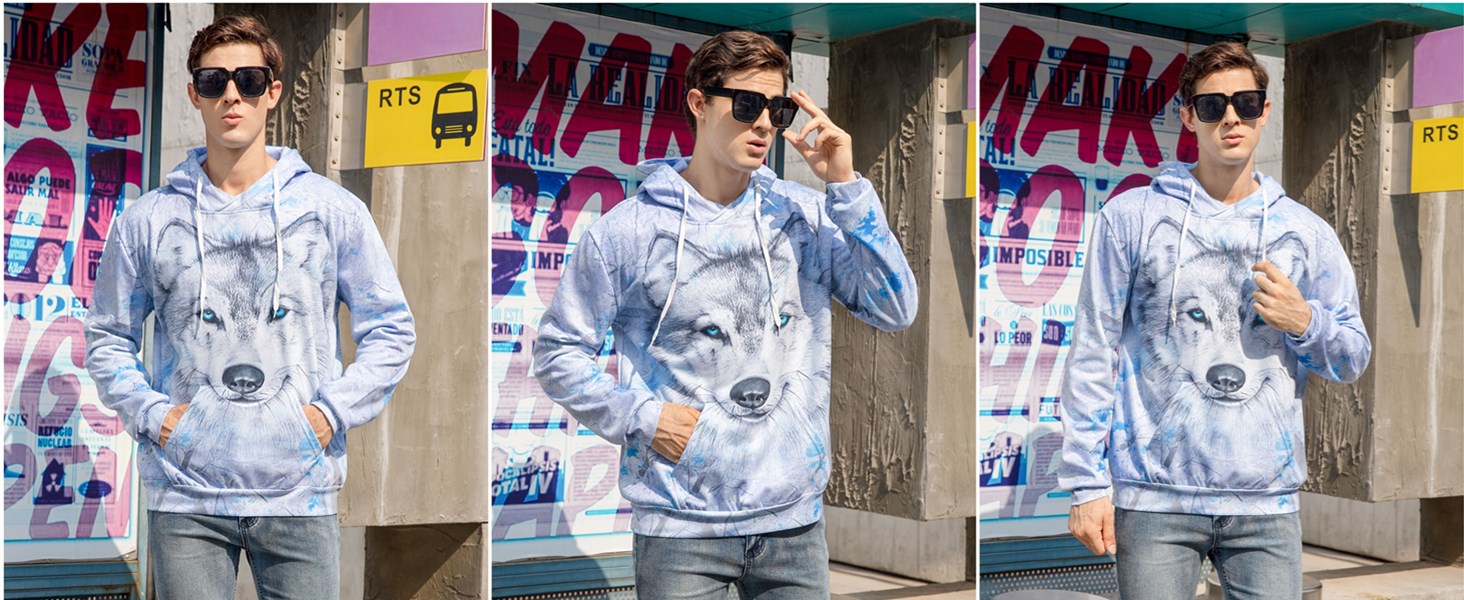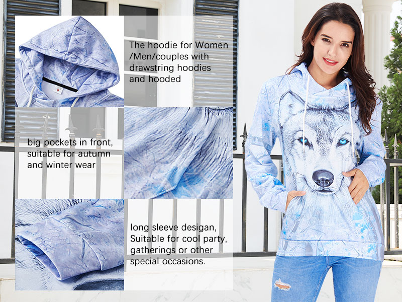 التصميم: تقنية طباعة ثلاثية الأبعاد عالية الدقة. هناك مجموعة متنوعة من عناصر الطباعة الواقعية العصرية، مثل بلورات الثلج والسحب السوداء والذئاب والنار وما إلى ذلك. نمط مطبوع ثلاثي الأبعاد لجعل هذه السترة ذات القلنسوة رائعة ومنع الألوان من التلاشي أو التشقق أو التقشير.