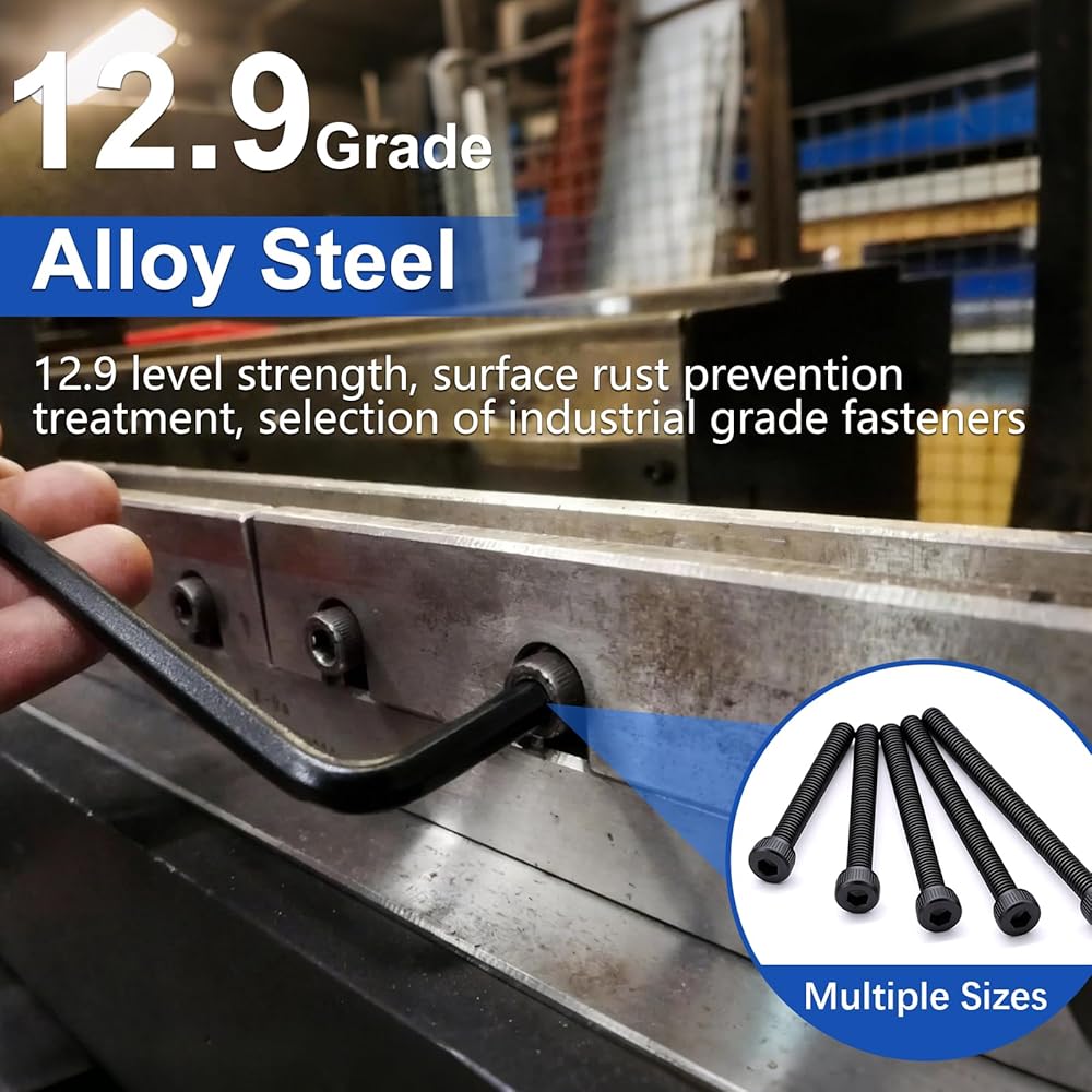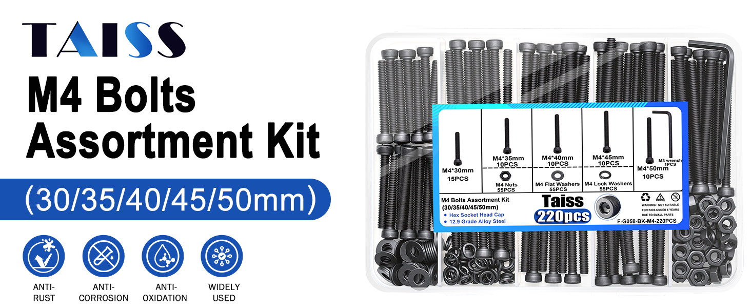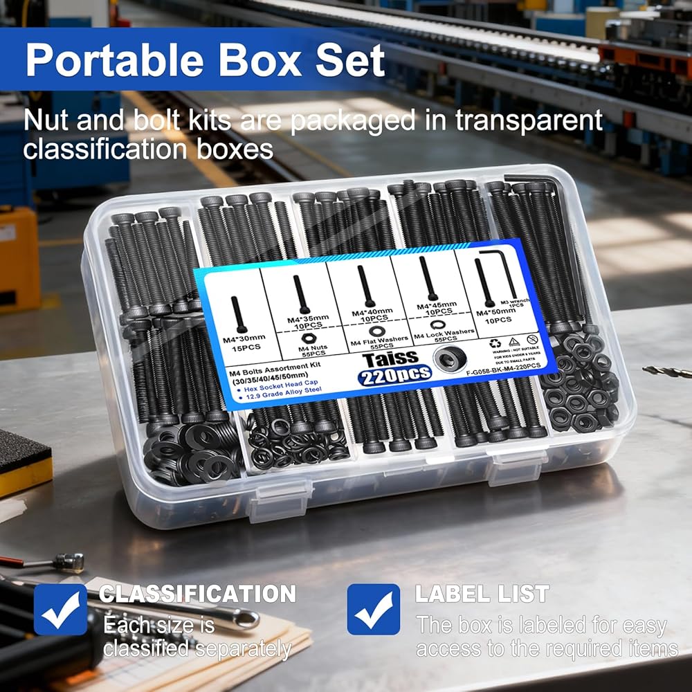طقم براغي Taiss 220 قطعة M4 M4 × 30/35/40/45/50 مم، براغي مترية لغطاء رأس مقبس سداسي أسود، مجموعة متنوعة من غسالات البراغي والصواميل، مسامير فولاذية من سبائك 12.9 درجة للطابعة ثلاثية الأبعاد