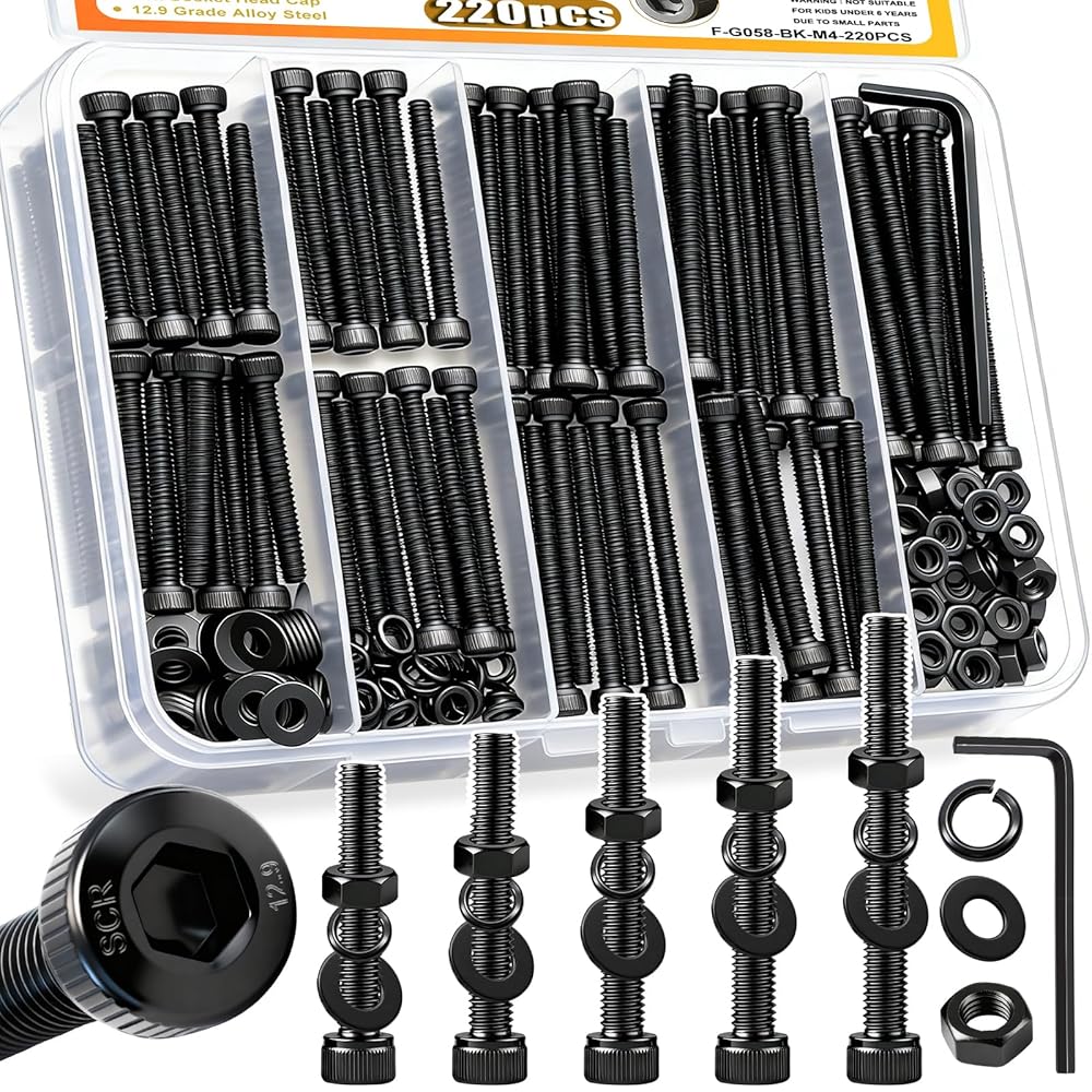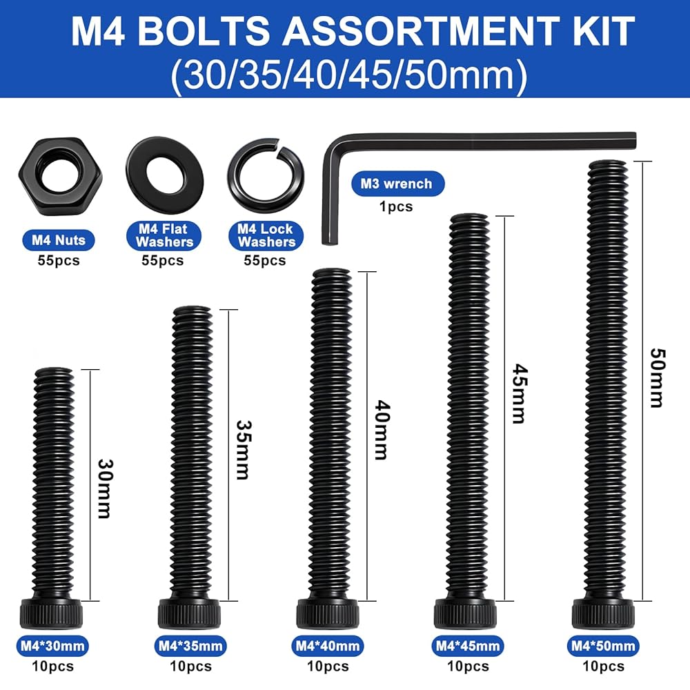 • 220 قطعة طقم براغي M4، 15 قطعة M4x30mm؛ 10 قطعة M4x35mm؛ 10 قطعة M4x40mm؛ 10 قطعة M4x45mm؛ 10 قطعة M4x50mm؛ 55 قطعة M4 صواميل؛ 55 قطعة M4 غسالات مسطحة؛ 55 قطعة M4 قفل غسالات؛ 1 قطعة مفتاح ربط سداسي.
