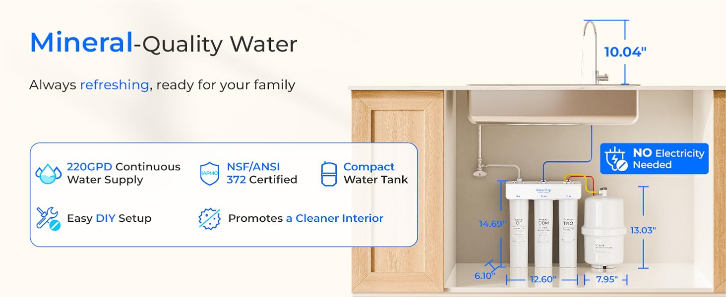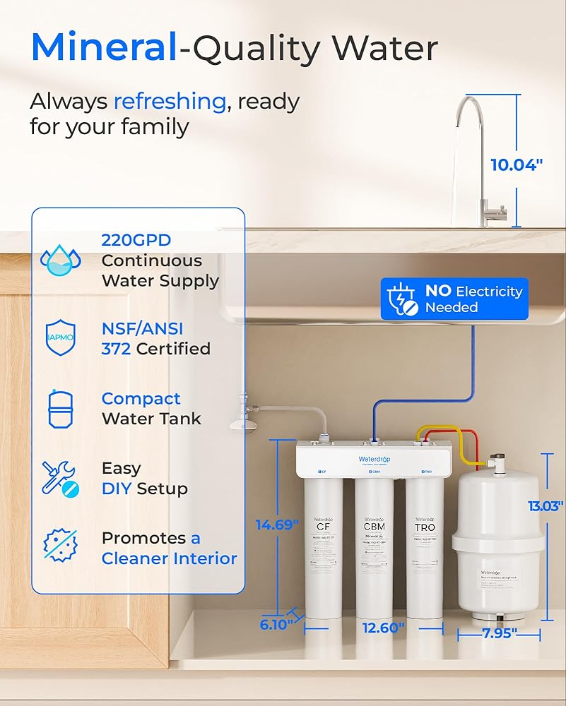 Waterdrop T3-T 220 GPD، نظام التناضح العكسي لإعادة التمعدن 7 مراحل، 2:1 نقي للتصريف، نظام تنقية مياه معتمد NSF/ANSI 372، فلتر مياه RO تحت الحوض مع خزان مياه، لا حاجة إلى طاقة