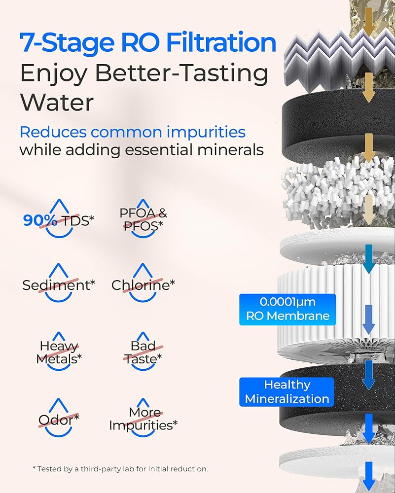 • [مياه منعشة معززة بالمعادن]: يتميز نظام التناضح العكسي Waterdrop T3-T بعملية ترشيح دقيقة من 7 مراحل مع غشاء RO 0.0001μm، مما يقلل ما يصل إلى 90% من المواد الصلبة الذائبة والكلور والمعادن الثقيلة وPFOA وPFOS. كما أنه يثري المياه النقية بالمعادن الأساسية للحصول على مذاق أنظف وأكثر انتعاشًا * تم اختباره في مختبر طرف ثالث