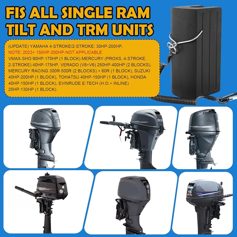 PRECISE FITMENT GUIDE: detailed for 40hp to 400hp. Specifically tailored to attach to the single ram piston, Methuker's Boat Saver is the premium choice for safeguarding your outboard motor. Enjoy enhanced protection and longevity for your boating accessories.PS:Compatible with (Update) Yamaha 4-Stroke/2-Stroke: 30hp-200hp, VMAX-SHO 90hp-175hp (1 block) Mercury (ProXS, 4-Stroke, 2-Stroke) 40hp-175hp, Verado (V8+V6) 250hp-400hp (2 blocks), Mercury Racing 300R-500R (2 blocks) + 60R (1 block), Suzuki 40hp-200hp (1 block), Tohatsu 40hp-150hp (1 block), Honda 40hp-150hp (1 block), Evinrude E-Tech (H.O.+ Inline) 25hp-130hp (1 block).NOTE: 2023+ 150hp-200hp-Not Applicable